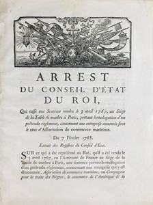 Slave trade. Arrest du Conseil du Roi, qui casse une Sentence rendue le 3 avril 1767, au Siege de la Table de marbre a Paris, portant homologation d’un pretendu reglement, concernant une entreprise annoncee sous le titre d’Association de commerce maritime