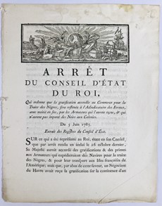 Slave trade Bounties. Arret du Conseil d’Etat du Roi, Qui ordonne que la gratification accordee au Commerce pour la Traite des Negres, sera restituee a l’Adjudicataire des Fermes, avec moitie en sus, par les Armateurs qui l’auront recue, & qui n’auront pas importe des Noirs aux Colonies, 1785