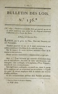 Repression of traffickers. Luigi XVIII, King of France. Bullettin des Lois n. 136. Ordonnance du Roi qui pourvoit au cas ou il serait contrevenu aux ordres de Sa Majeste concernant l’Abolition de la Traite de Noirs, 1817