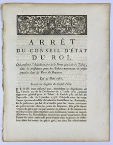 Tobacco and Corsairs. NECKER - MOREAU DE BEAUMONT.? Arrêt du Conseil d'Etat du Roi qui confirme l'adjudicataire de la ferme générale du tabac dans la préférence pour les tabacs provenans de prises amenées dans les ports du royaume
