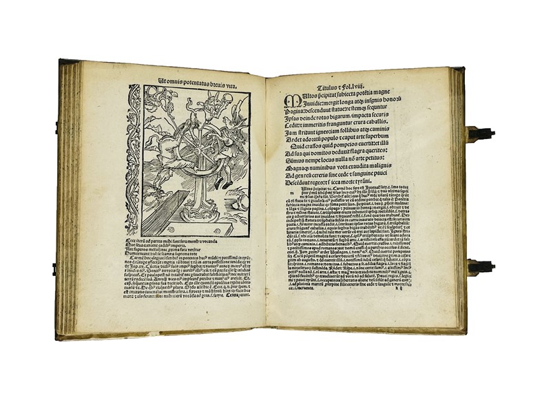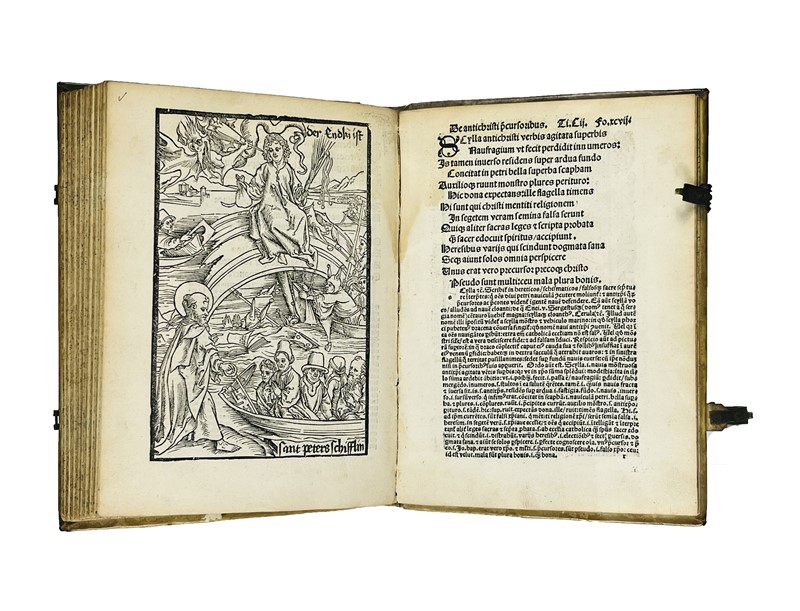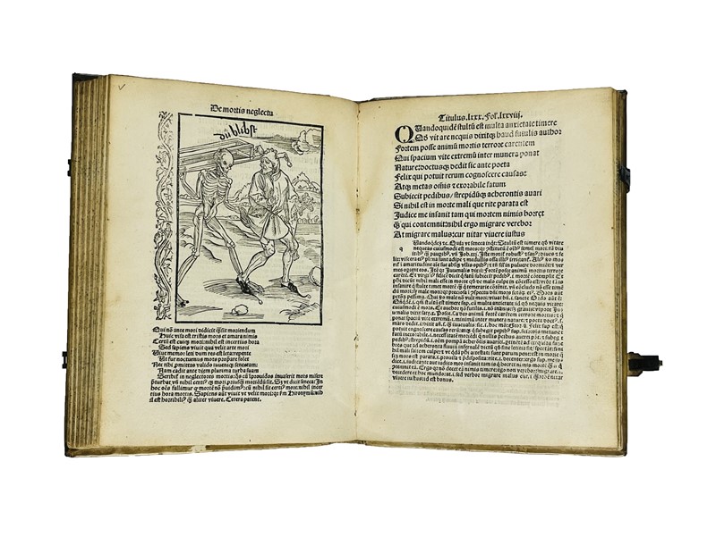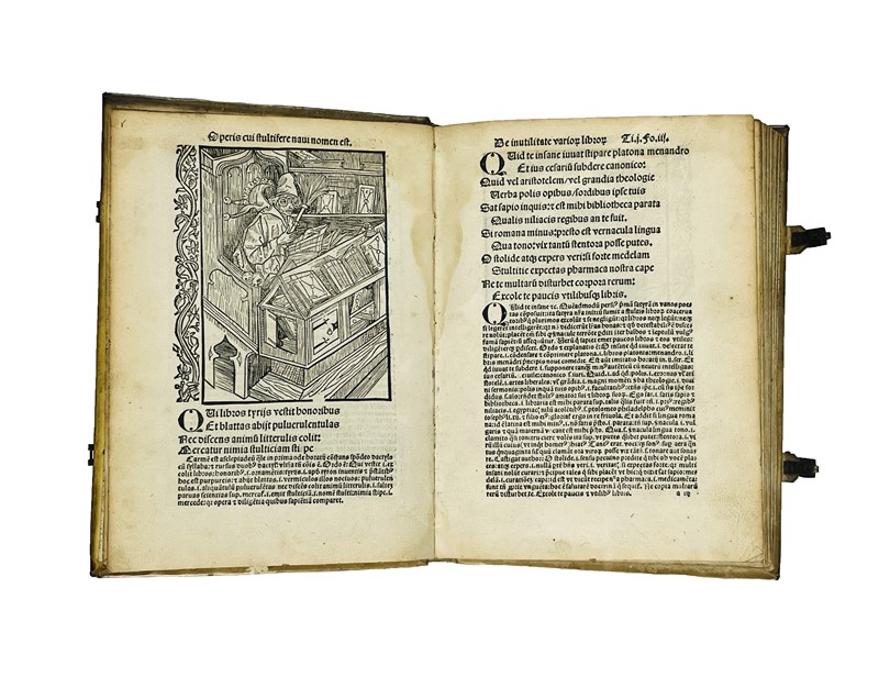 In 4to. 204x145 mm. Legatura del XVII secolo, pergamena rigida, dorso liscio con titolo manoscritto, fermagli in ottone e pelle, tagli a spruzzo. Carte Cvii, [1]. Il titolo continua con “& lepidissimis Teutonice lingue rithmis decorata: deinde ab Iacobo Lochero philomuso Latinitate donata: & demum ab Iodoco Badio Ascensio vario carminum genere non sine eorundem familiari explanatione illustrata.” Colophon sul recto dell’ultima carta non numerata “Impressum Basilee p[er] Nicolaum Lamparter, M.cccccvij. Die xv. mensis Martij”. Frontespizio in rosso e nero con illustrazione che raffigura la nave, Marca tipografica sotto il Colophon, 115 xilografie nel testo, inclusa quella del titolo, una piena pagina, le altre di tre quarti di pagina, bordate da un fregio decorativo.