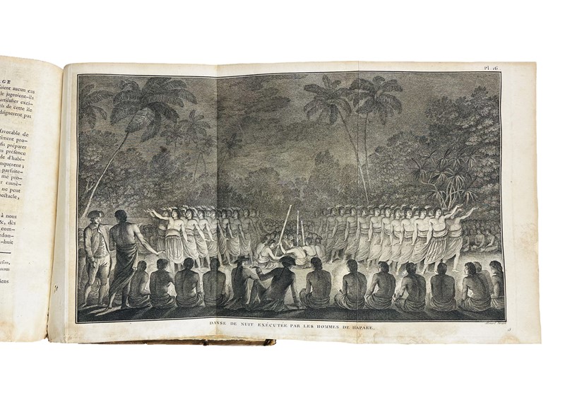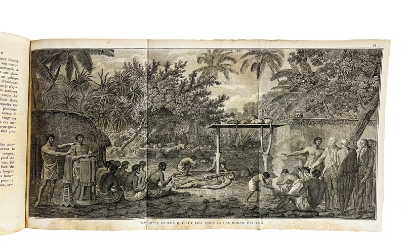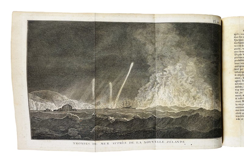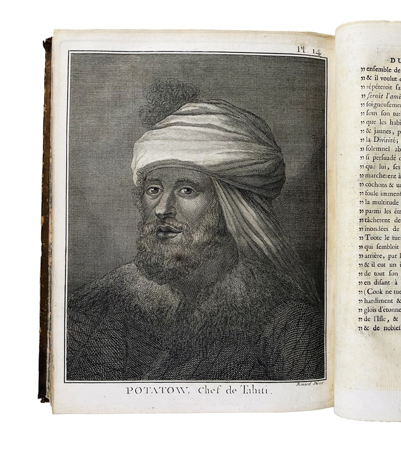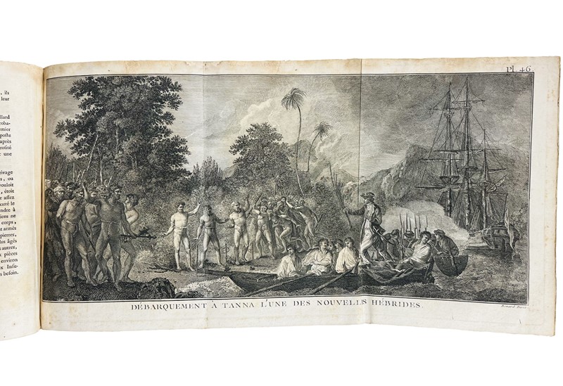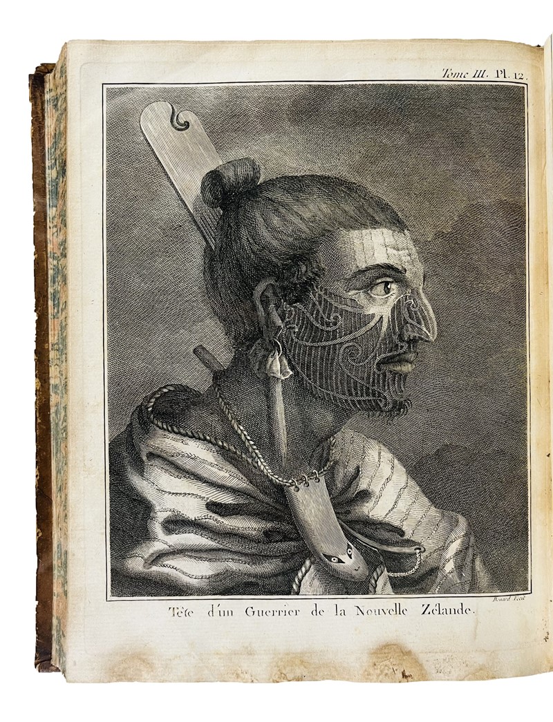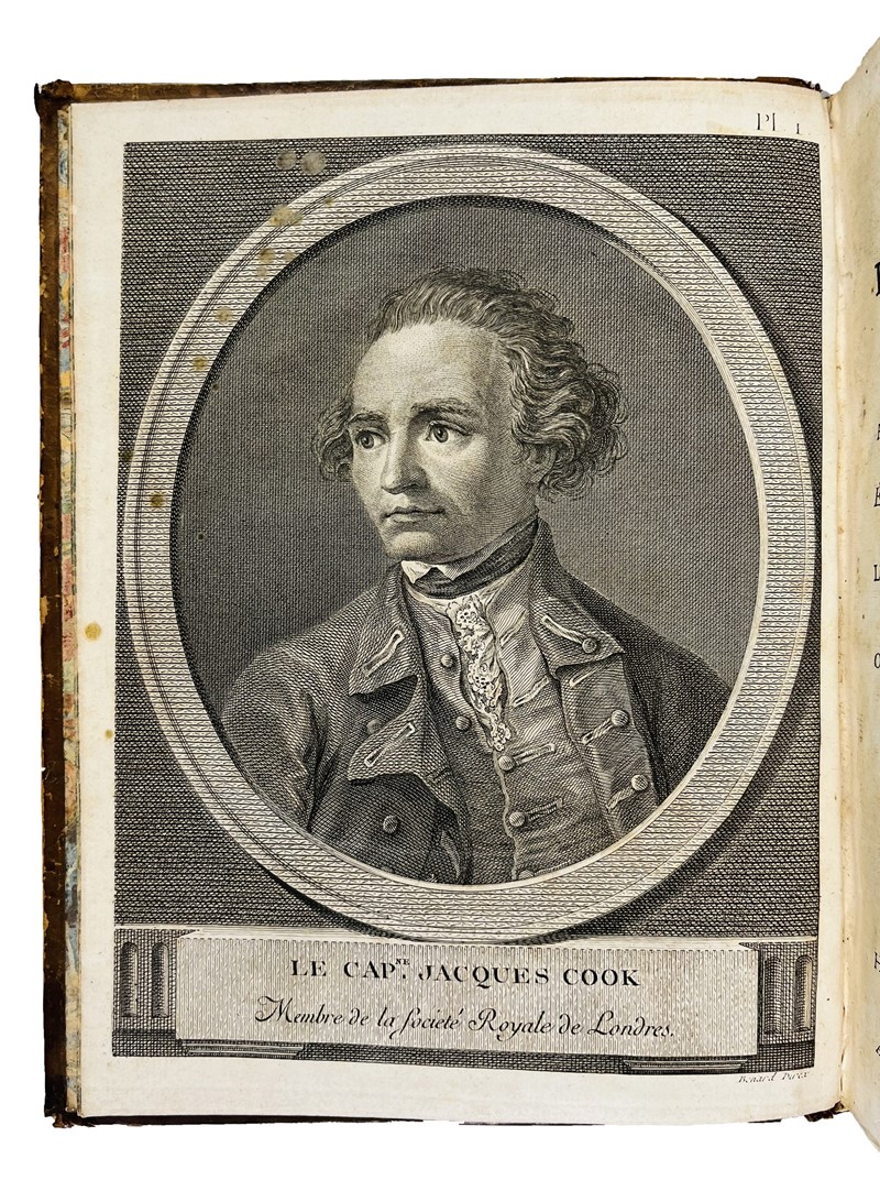 Very rare 4to first French edition with the complete collection of Cook's voyages. The most important account of circumnavigation in the 18th century, beautifully illustrated. The work contains a total of 223 copper-engraved Tables depicting maps, views, fauna, flora, genre scenes, costumes, portraits of native characters, antiquities, weapons: with Cook's Portrait and his death in the large folded frontispiece, which is often missing; also, the large map depicting the ‘Southern Hemisphere’, the planisphere depicting all Cook's discoveries, 2 language plates, a map depicting the ‘South Sea’ and the ‘Table de comparaison’.