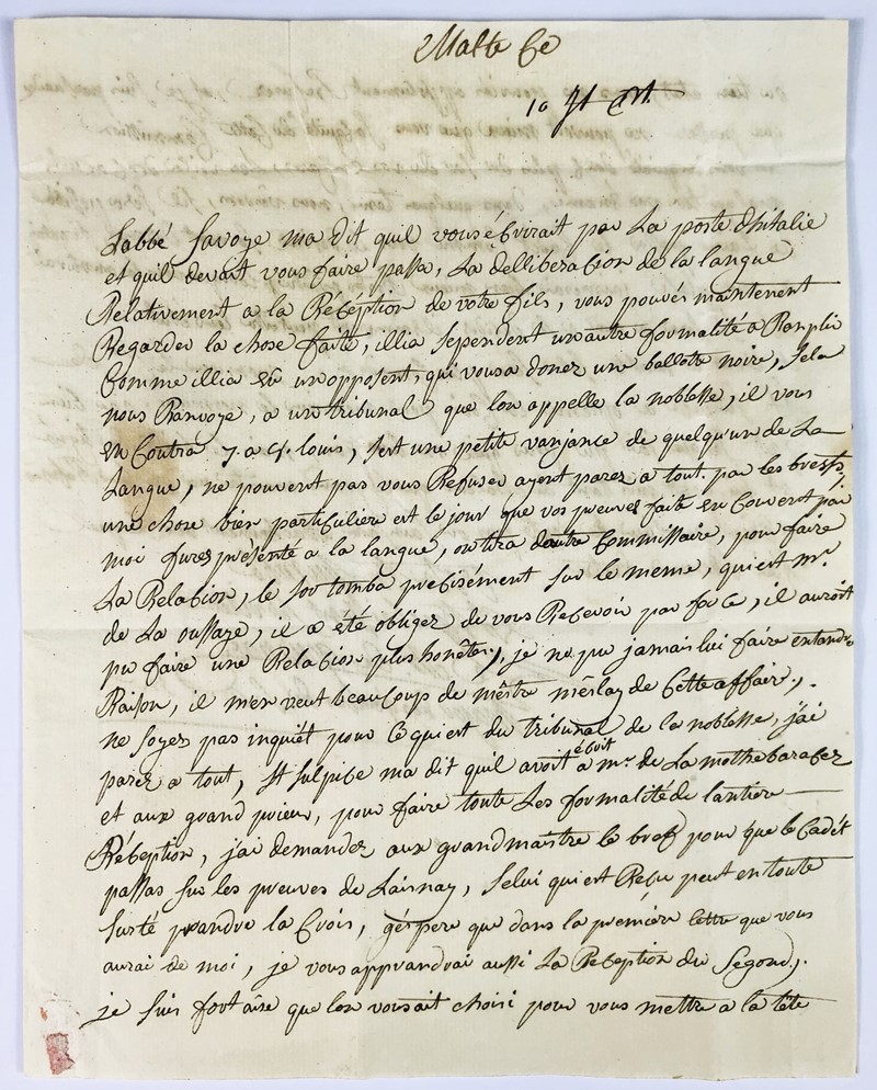 Maurice de Gournay, che si firma con la sua carica di ‘Major des gardes’ rassicura il banchiere di Poitiers riguardo l’ammissione dei suoi due figli nell’Ordine di Malta, nonostante l’opposizione di Signor de la Houssaye. Nell’incipit è citato un importante rappresentante dell’Ordine, che farà in seguito una prestigiosa carriera: l’Abbé Louis Savoye, Malta 1756, nel 1782 fu eletto Segretario della Venerabile ‘Langue de France’. Nel 1787 divenne ‘chapelain conventuel’; il 1 novembre 1793, Rohan lo nominò ‘Recteur de l’eglise collegiale de la Grotte de St Paul a Rabat (Malta).