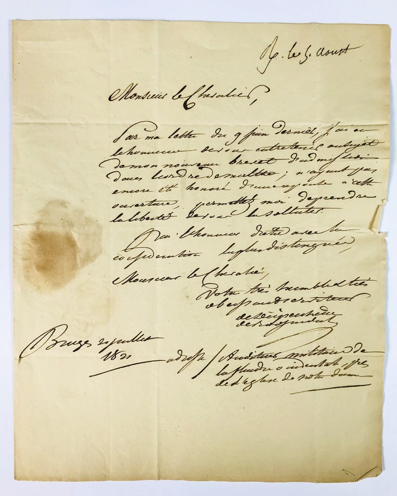 Bifolio. 222x175 mm. Testo in francese sulle prime 2 pagine, con firma in fine. Pagina 3 bianca. Indirizzo sulla quarta pagina ‘Monsieur Laurence fils banquier … Poitiers’. A pagina 4, timbri e traccia di sigillo araldico in ceralacca rossa. Tracce d’uso.