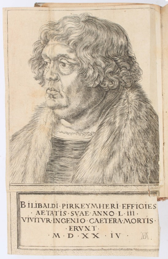 Rarissima Prima edizione. Contiene le traduzioni di Willibald Pirckheimer, 1470-1530, di testi di autori classici, una poesia di Erasmo, una descrizione del carro trionfale dell'imperatore Massimiliano e altre opere, nonché la prima biografia del grande umanista, scritta dal pronipote Johann Imhoff. L’edizione contiene il ritratto solenne di Pirckheimer, solitamente mancante, con il monogramma AD di Durer.