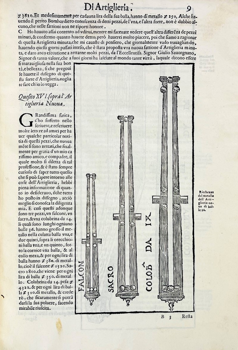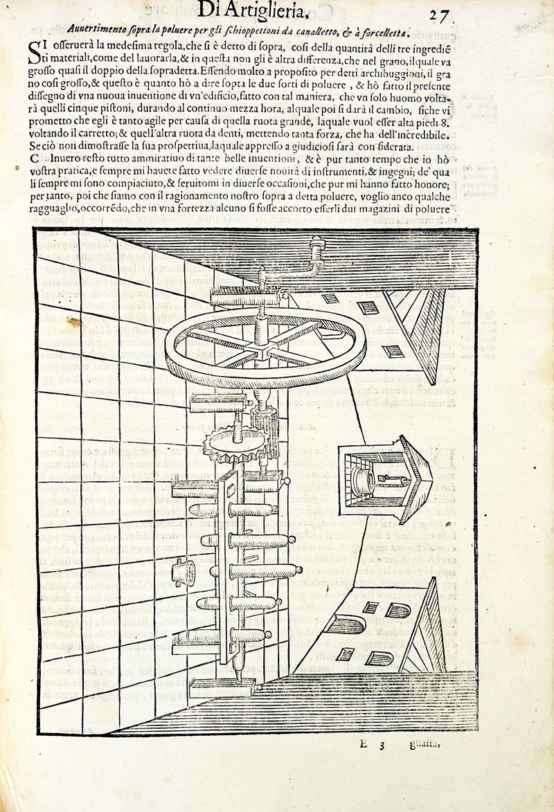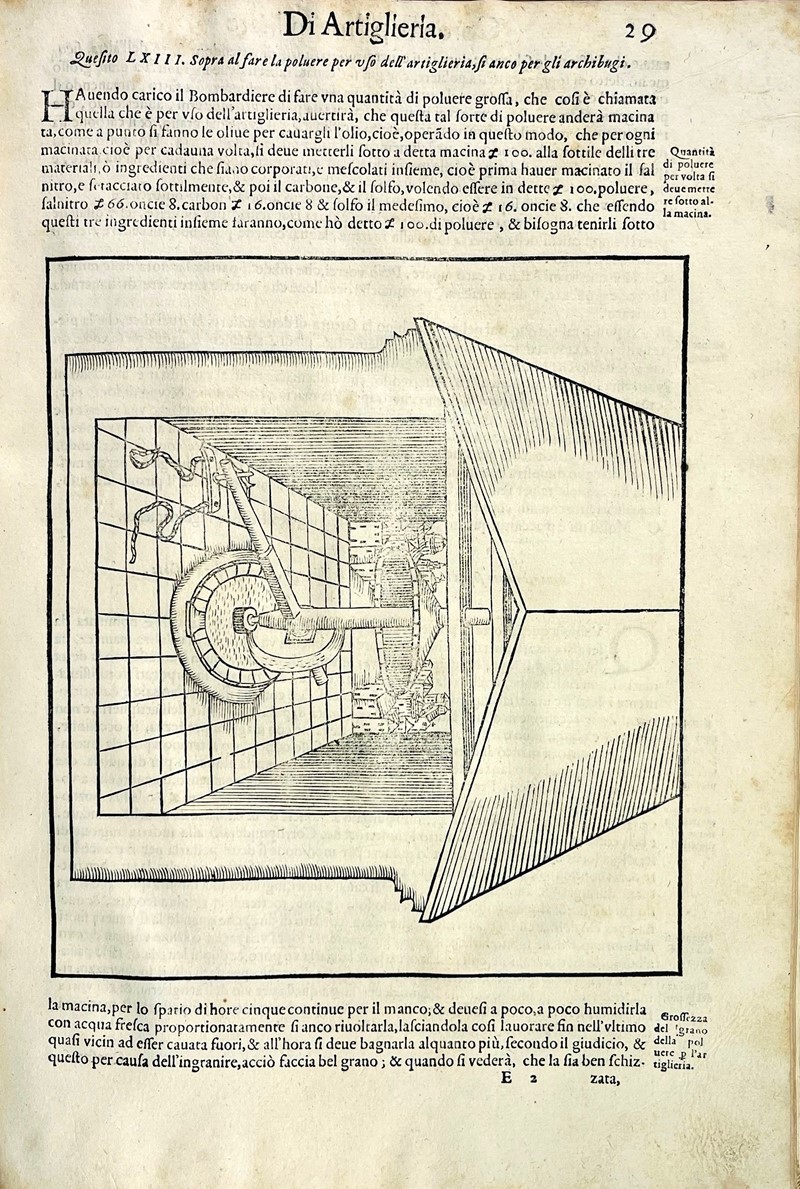 Rara Edizione di quest’importante opera sull’artiglieria, riccamente figurata. Sono illustrati moltissimi diversi ordigni e congegni da fuoco; dalla c. 47 v. il trattato sullo strumento per misurare le distanze, di cui è spiegato il funzionamento e il metodo per fabbricarlo.