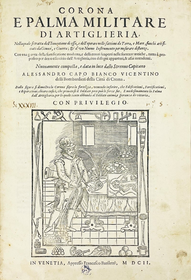 CAPOBIANCO, Alessandro. Corona e Palma Militare di Artiglieria, Nella quale si parla dell’Invenzione di essa, e dell’operare nelle fattioni di Terra, e Mare, fuochi artificiati da Giuoco, e Guerra; & d’un Nuovo Instrumento per misurare distanze…