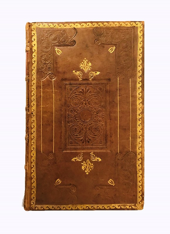4to. mm. 235x143. Legatura d’amatore, piena pelle beige-oliva chiaro, impressioni a secco e decorazioni in oro sui piatti, titolo su tassello rosso e fregi in oro sul dorso. Pagine XIX, 1 bianca, 293, [5].