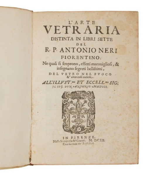 Prima edizione del primo libro dedicato al vetro, alla sua fabbricazione e coloritura. Honeyman: “Many of the secrets of glassmaking are here recorded for the first time. Neri is believed to have learned the art of glassmaking at Murano, near Venice.” D.S.B.: “Neri is remembered for L'arte vetraria, 1612, a little book in which many, although by no means all, of the closely guarded secrets of glassmaking were printed for the first time. He recommended that glass be made from rocchetta, a fairly pure sodium sesquicarbonate from the Near East, and tarso, which he described as a kind of marble but which must have been some form of silica. He did not indicate the source of the necessary proportion of lime. The main part of the text deals with the coloring of glass with metallic oxides to give not only clear and uniform colors but also various veined effects. There are chapters on making lead glass of high refractive index and enamel, opaque, glass by the addition of tin oxide.” Singer: “The greater part of the book is devoted to the coloration of glass, both to imitate gemstones and for the use of enamellers.”