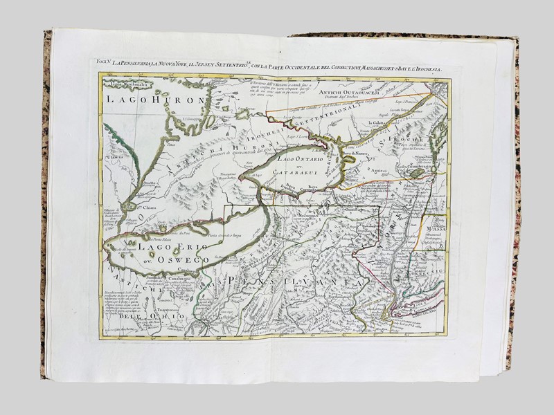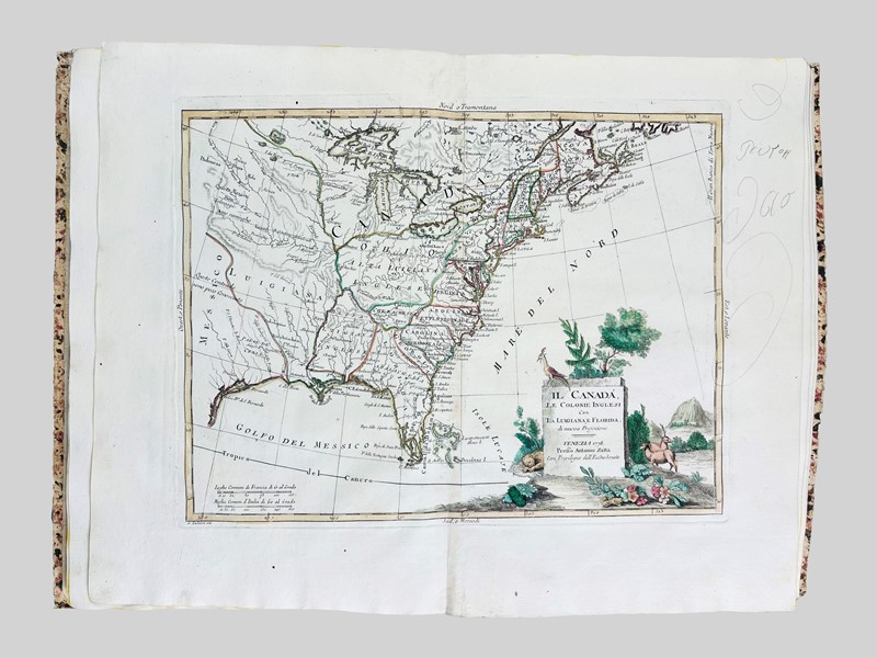 Rara prima edizione di questo importante atlante, completo delle sue 15 mappe colorate a mano, che costituiscono l’interpretazione con correzioni fatta da Zatta della famosa carta geografica degli Stati Uniti disegnata da John Mitchell nel 1755, come spiega Zatta nell’“Avvertimento dell’Editore. Il frontespizio decorativo con una mappa interna delle Bermuda è seguito da una mappa generale delle tredici colonie, da 12 fogli che dettagliano i territori degli Stati Uniti di cui formano una grande mappa, si trovano in questa opera anche una mappa delle “Isole di Terra Nuova e Capo Breton”, e una della “Baja d’Hudson, Terra di Labrador, e Groenlandia con le isole adiacenti”. Le mappe furono successivamente incluse da Zatta nel suo celebre Atlante novissimo.