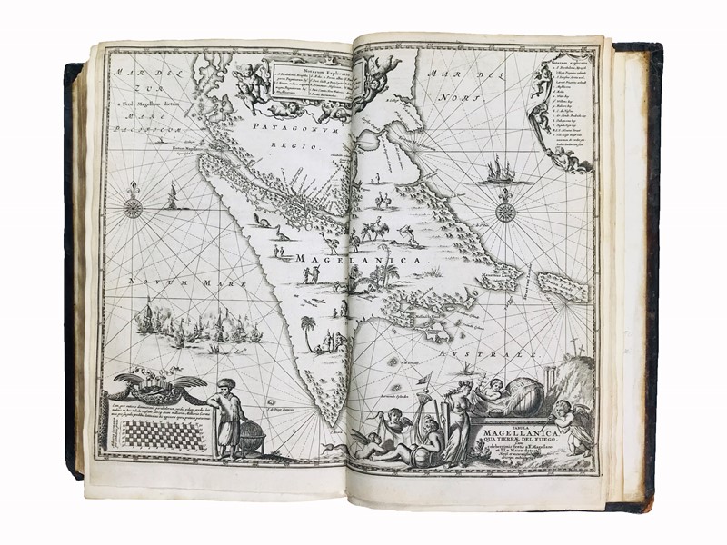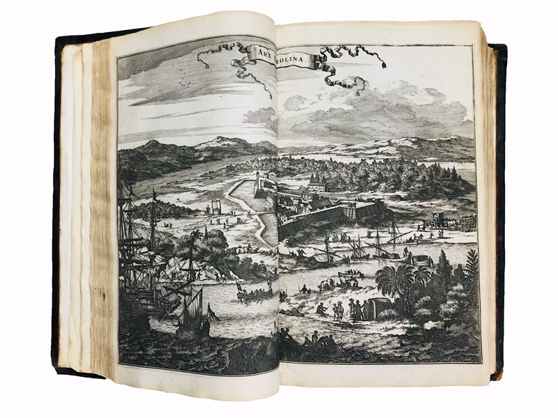 In totale 56 Tavole incise in rame: Antiporta figurata, 7 ritratti a piena pagina (Johan Maurits, Colombo, Vespucci, Magellano, l'ultimo imperatore inca Atahualpa, Pizarro e l'imperatore azteco Montezuma), una grande mappa ripiegata dell’America di Gerard Schagen, 15 mappe a doppia pagina, 32 tavole a doppia pagina o ripiegate. Ex libris di C.G. Little incollato nel contropiatto anteriore.