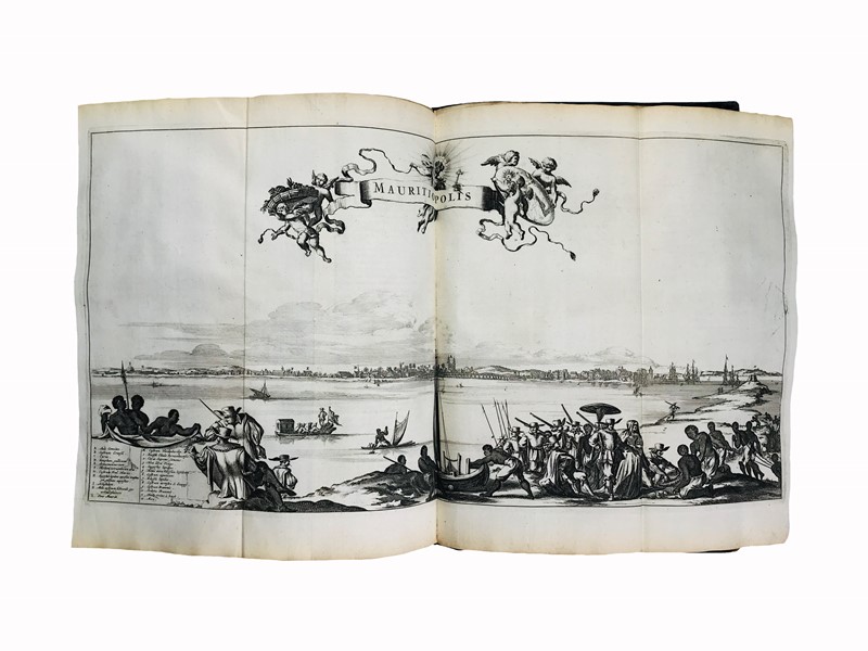 Folio. 320x200 mm. Legatura coeva in pelle, reimbotage del dorso, fogli di guardia moderni, titolo in oro al dorso. Antiporta figurata con titolo, Frontespizio in rosso e nero con vignetta incisa, Ritratto di Jan Maurits, Carte 2 non numerate (Dedica con grande Testatina incisa alla c. *3, con stemma), grande carta ripiegata dell’America, Pagine 585, [27 con Indici], 53 Tavole fuori testo e 69 incisioni sul testo.