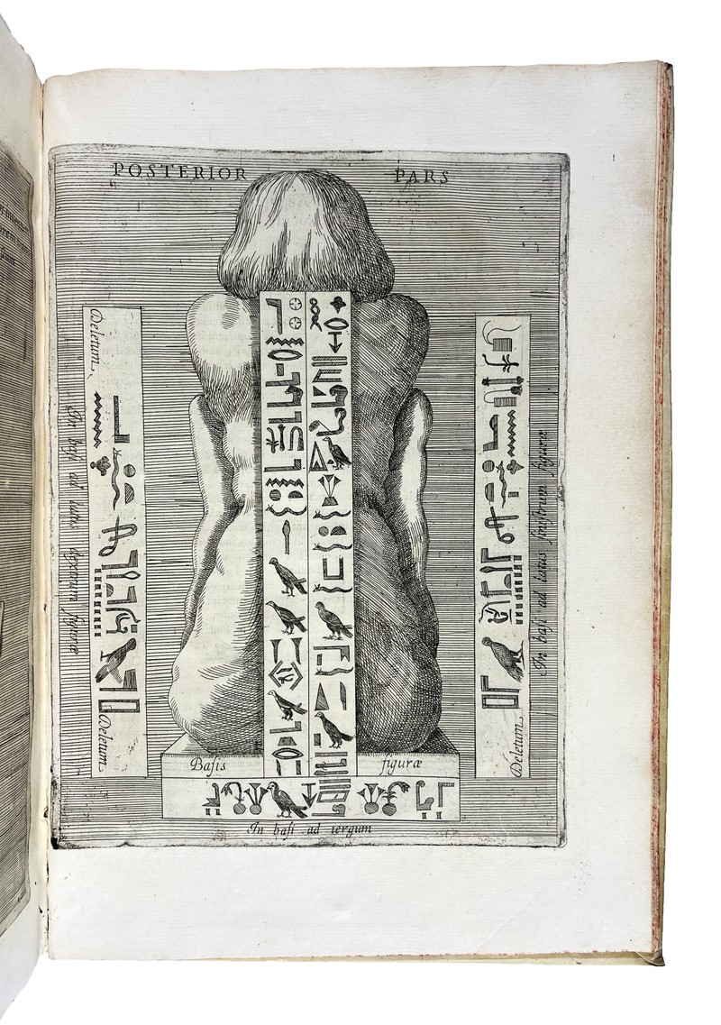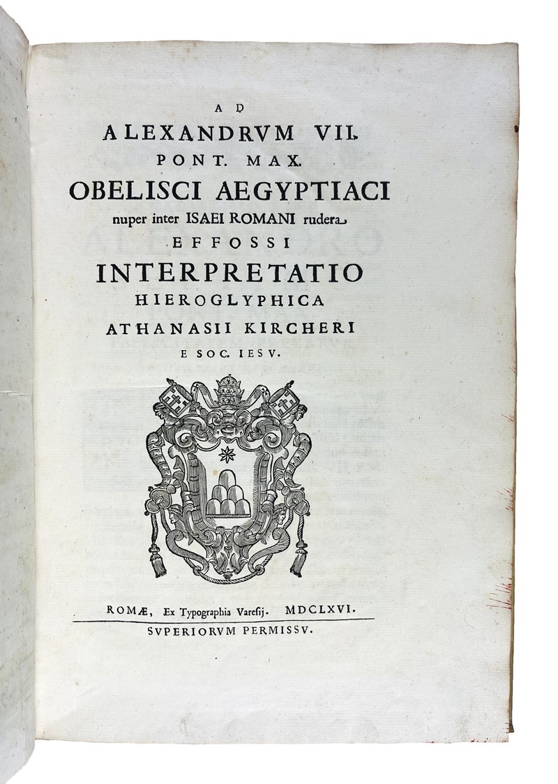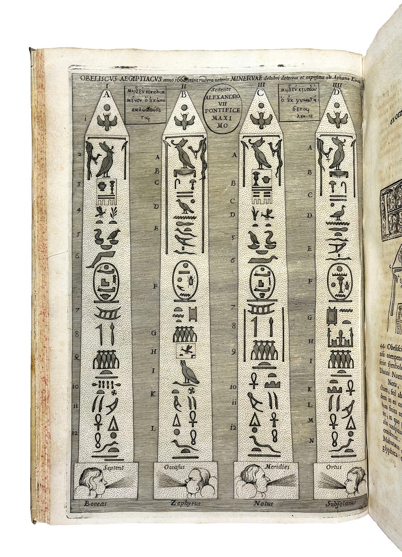 Prima ed unica edizione di questo importante studio di egittologia. Merrill: «Description and interpretation of Egyptian obelisks found around Rome». Caillet: «Tres curieux, enrichi de figures mystérieuses et hiéroglyphiques sur bois et sur cuivre». Opera magnificamente figurata, dedicata a papa Alessandro VII che, nel 1665, commissionò a Kircher lo studio di un piccolo obelisco rinvenuto nell'orto botanico dei frati domenicani di Santa Maria sopra Minerva. L'obelisco è oggi visibile, nella piazza antistante la chiesa, in cima all'elefante del Bernini. Una tavola raffigura l'obelisco così com'è ancora oggi a piazza della Minerva a Roma. La tavola alla carta N2r (p.109) è firmata Giovanni Battista Galestruzzi.