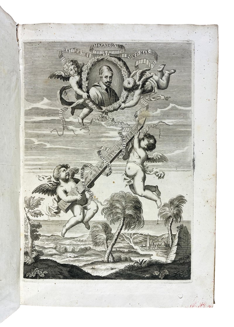 In folio, 355x245 mm. Legatura in piena pergamena, titoli manoscritti al dorso, tagli rossi a spruzzo. Targhetta con collocazione applicata al piatto anteriore. Pagine [28, inclusi Antiporta e Frontespizio], 146 [i.e. 136], [8]. Iniziali e fregi xil., numerosi passaggi stampati in Greco, Ebraico e in Arabo. Antiporta allegorica incisa su rame contenente anche il ritratto del dedicatario, Alessandro VII; 10 tavole incise su rame, di cui otto a piena pagina, e numerose figure xilografiche nel testo. Alcuni forellini di tarlo nel margine inferiore bianco che non intacca il testo. Bell’esemplare.