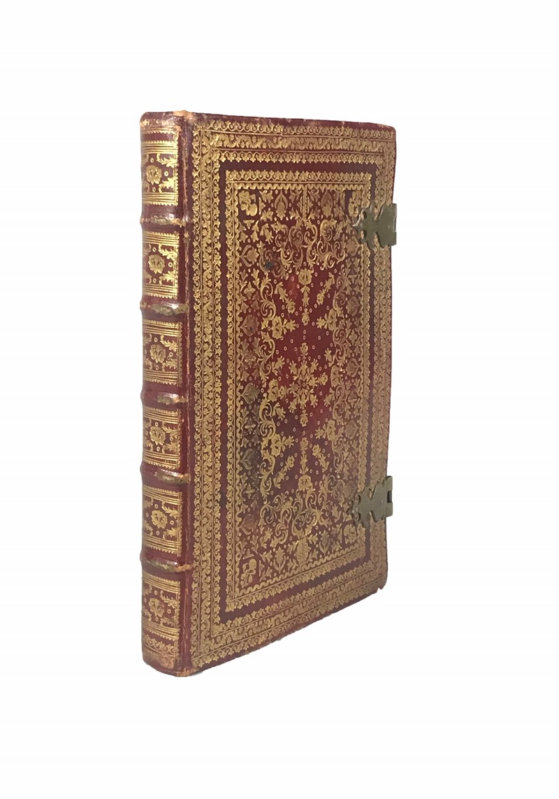 Folio. 315x208 mm. Legatura coeva in marocchino rosso con decori in oro, ai piatti, riccamente intarsiati ai piccoli ferri, elaborate cornici concentriche e fleurs centrali, dorso a 5 nervi in rilievo con scomparti ornati in oro, fogli di guardia in carta marmorizzata, fermagli in ottone.