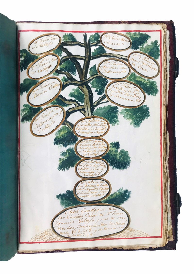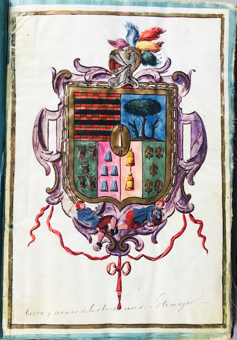 Bella Patente di Nobiltà manoscritta, con cinque grandi miniature, in magnifica legatura originale. L’opera contiene i titoli nobiliari di due famiglie della Galizia, Sotomayor e Vallejo, originarie di Montrreal de Baiona, stabilite a Siviglia nel XVIII secolo. Le composizioni miniate, ssono : Blason y armas de la ilustre casa de Sotomayor, albero genealogico Sotomayor, Titolo iscritto in cornice ornata, tutto su pergamena ; Blason y armas de la casa del noble apellido de Vallejo, Arbol genologico de las ilustres casas de Don Juan Ignacio Vallejo.