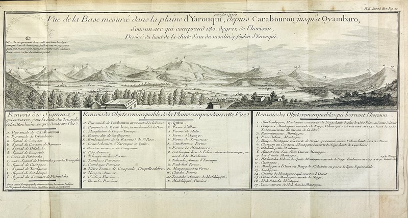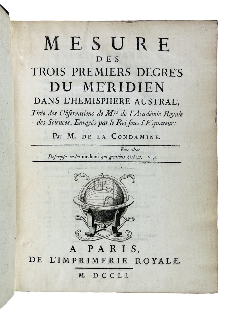 I: Mesure des trois premiers degrés du Méridien. Primo resoconto completo delle operazioni scientifiche svolte durante la famosa spedizione dell'autore in Perù, il cui scopo era misurare il meridiano all'equatore. Un'altra spedizione fu inviata, sotto la direzione di Maupertuis, per misurare il meridiano al Polo Nord, e fu la sintesi dei risultati delle due missioni che permise di confermare, per la prima volta, l'ipotesi di Newton sull'appiattimento del globo terrestre nelle regioni polari. Oltre alle misurazioni geodetiche e astronomiche effettuate dall'autore, in particolare per mezzo di un telescopio zenitale di sua invenzione che egli descrive, l'opera contiene le ricerche dell'autore sul pendolo. L'opera è illustrata da tre tavole incise fuori testo, due delle quali ripiegate. La tavola su piena pagina rappresenta il telescopio dell'autore. Opera su un volume.
