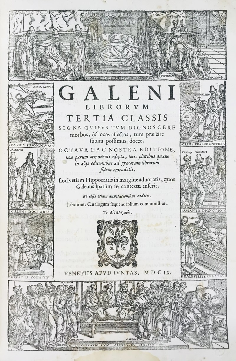 Rara edizione giuntina, con traduzione e cura dei più importanti studiosi dell’epoca. I libri della Seconda Classe sono dedicati all’arte di conservare la salute riguardano la dieta, l’alimentazione, il bere, il sonno, il movimento e anche i problemi di carattere psicologico. L’opera comincia con il commento di Galeno al libro di Ippocrate sull’Aria, Acqua e Luoghi. I libri della Terza Classe riguardano le cause delle malattie, l’esame dei sintomi e contengono la descrizione clinica di diverse affezioni, come la difficoltà di respirare, la palpitazione, i tumori. Da carta 225 verso comincia il suo importante commento alla teoria degli umori di Ippocrate. Le opere di Galeno costituiscono un vasto compendio in cui vengono analizzate tantissime tematiche di natura medica, i cui punti di vista hanno dominato la medicina occidentale per tredici secoli, fino al Rinascimento, quando cominciarono lentamente e con grande cautela a essere messi in discussione. Dal suo nome deriva la “galenica”, ovvero l’arte del farmacista nella preparazione dei farmaci.