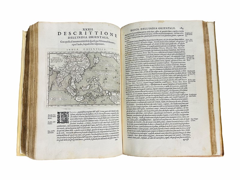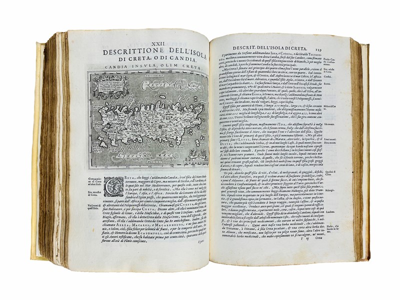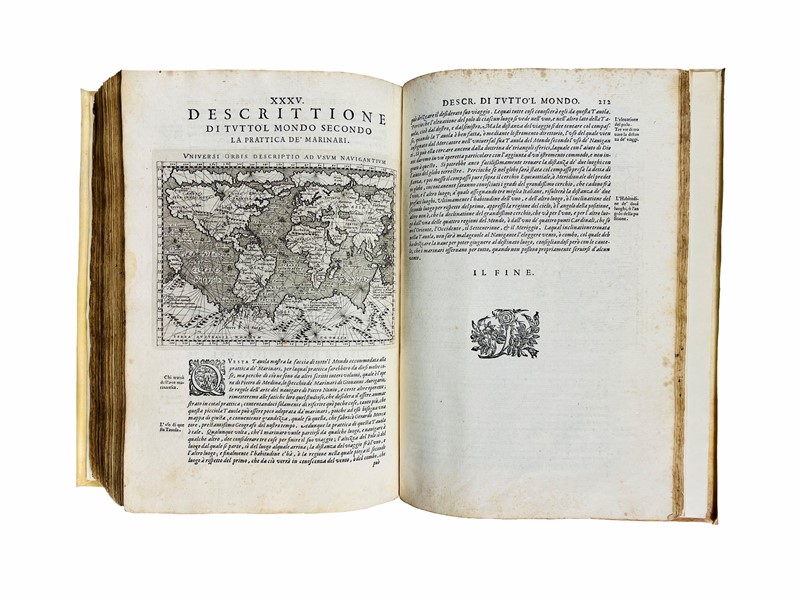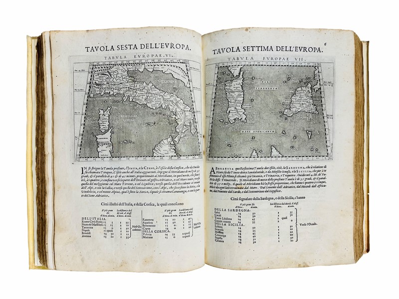 2 parti in un volume in folio, mm. 304x210. Legatura del XX secolo, piena pergamena rigida con unghie, titolo manoscritto al dorso. Carte [2], 62, 21, 1 bianca, [14]; 212, compreso Frontespizio, [30]. Frontespizi con vignetta incisa, carattere tondo e italico, Testatine, Finalini e Iniziali xilografiche, numerose xilografie nel testo. In totale 2 Frontespizi con vignetta e 64 carte geografiche incise in rame da Girolamo Porro, compreso il mappamondo a p.p. fuori testo. Ex libris araldico del conte Sanminiatelli incollato al contropiatto. Restauro all’angolo superiore della carta Q3, frontespizio e prime carte con arrossature, nel testo lievi fioriture e occasionali macchioline, esemplare con ampi margini.
