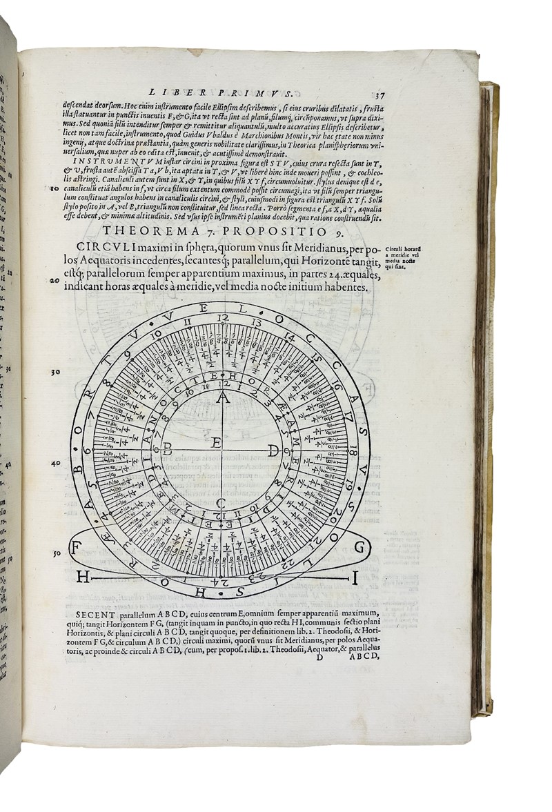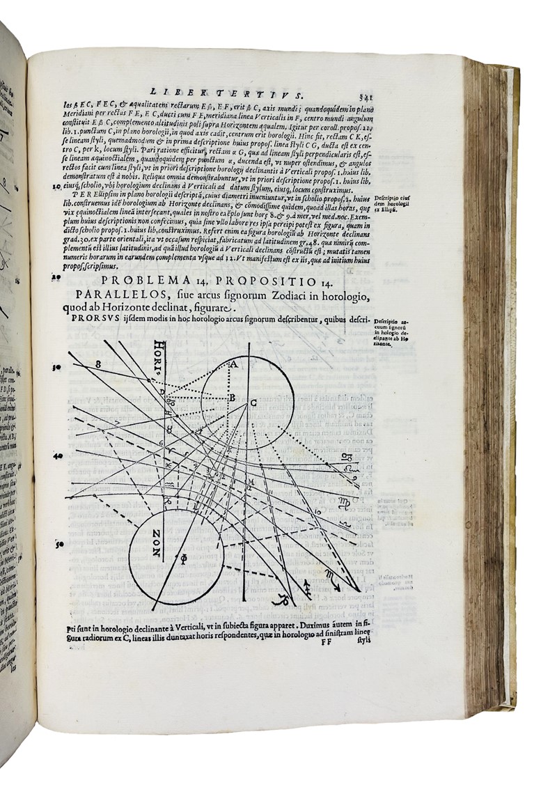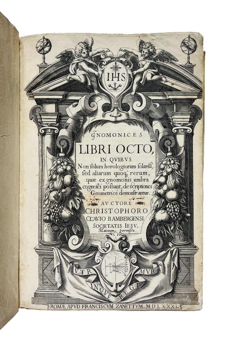 Prima edizione di questa celebre opera, “Summa” della gnomonica rinascimentale, che fu scritta per mano del noto gesuita Cristoforo Clavio. In questa opera “l'Euclide del XVI secolo”, così fu etichettato il Clavio, raccoglie tutto il sapere della gnomonica basata sugli studi geometrici. L’autore risiedette a lungo a Roma, dove redasse molte opere di carattere scientifico - astronomico; fu professore di matematica, nel Sacro Collegio Romano; collaborò alla riforma Gregoriana del calendario. Nel 1611 Galileo si rivolse a lui per superare le diffidenze contro le sue scoperte astronomiche, ma Clavio non si pronunziò.