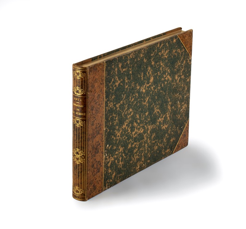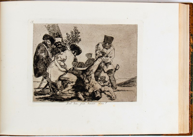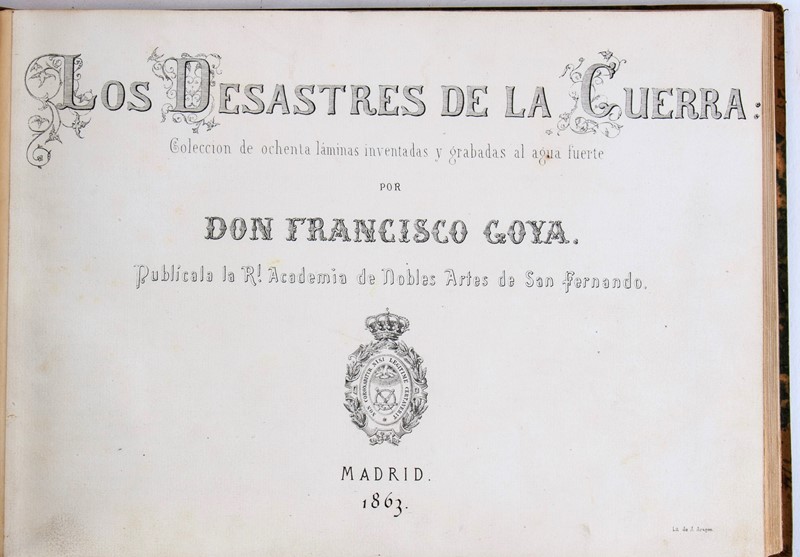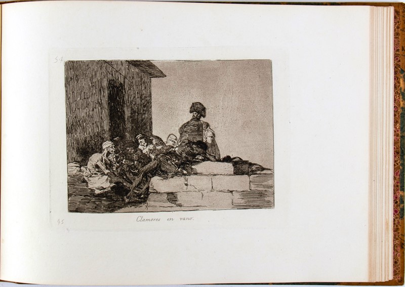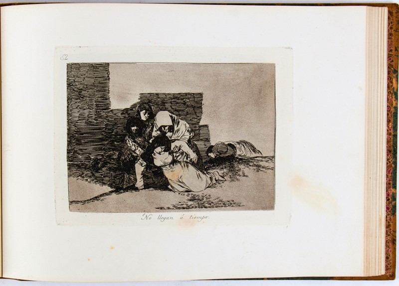 In-folio oblungo. 239×325 mm. Legatura in mezza pelle, Piatti marmorizzati con filetti in oro, angoli, dorso con titolo e fregi in oro, dorso con titolo e donazioni in oro, sguardie marmorizzate. Frontespizio con Emblema del Re sormontato da Corona, impresso in xilografia, 1 foglio di testo con la biografia di Goya, 80 tavole numerate all'acquaforte, acquatinta, puntasecca e lavis, stampate con inchiostro seppia su carta forte. 37 fogli recano la filigrana “J.G.O.” o Palmetta, o entrambe. Lieve foxing nella carta con la biografia, in complesso bell’esemplare.