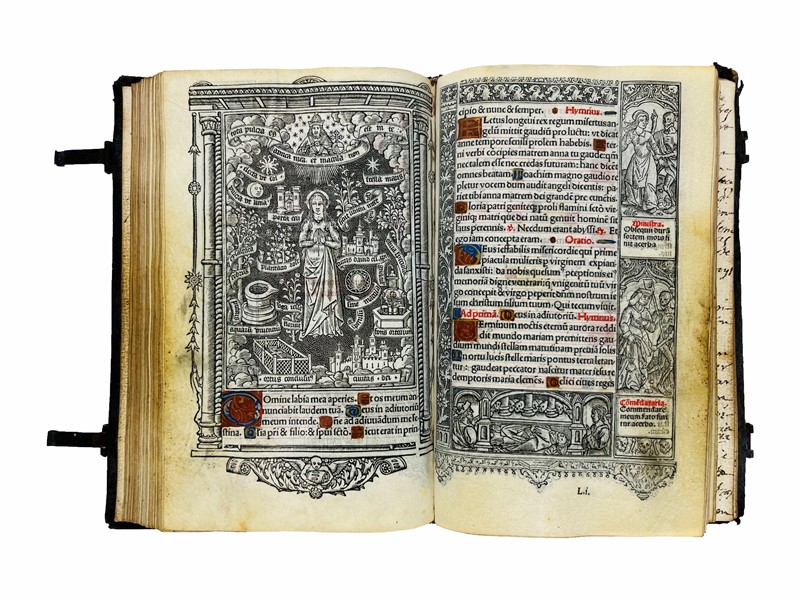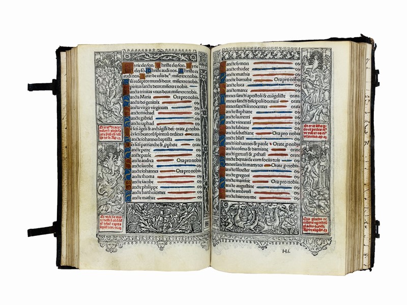 Oltre alle magnifiche illustrazioni a piena pagina, fra le quali spiccano il Frontespizio con il monogramma dello stampatore e la celebre tavola con l’Uomo Anatomico, questa edizione è particolarmente preziosa per le grandi bordure figurate che incorniciano il testo. Fra queste, una stupefacente Danza della Morte che accompagna l’Ufficio dei Morti: il ciclo della Danza macabra illustra tutte le pagine dalla carta m8 verso alla carta p8 verso