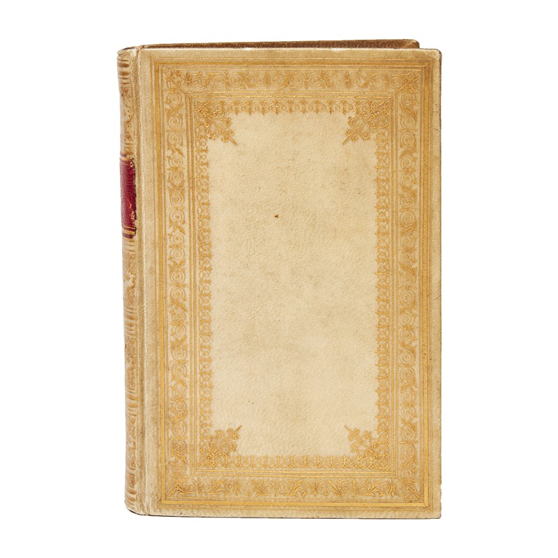 8vo. 145x90 mm. 19th century gilt decorated vellum with gilt frame on covers, richly gilt spine, red label, modern red marbled endpapers, red upper edges. Pp. [16], 279, [1]. Italic type, title and verso of final leaf with woodcut printer's device, initial spaces with guide-letters. Some leaves with water stains on the margin, especially lower. Handwritten Note from Bradford Coll-[ege] de Wolf, Cambridge dated 1891. Good copy.