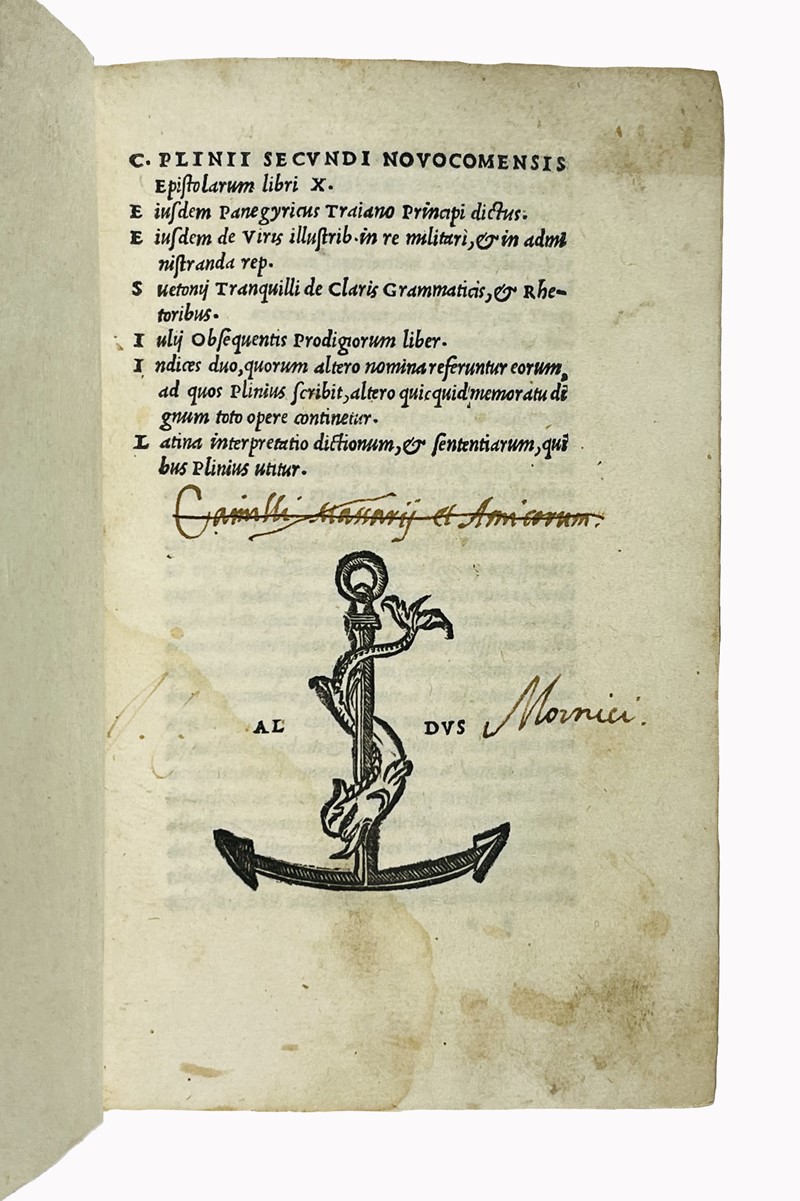 Seconda edizione aldina delle epistole di Plinio il Giovane, ristampa della prima del 1508, con la stessa lunga dedica di Aldo ad Alvise Mocenigo e con la stessa curiosità della numerazione delle pagine impressa sempre in alto a destra. Rispetto alla prima, tuttavia, quest'edizione ha in più il ricco ''Index rerum memorabilium'' e la ''Latina interpretatio dictionum et sententiarum graecarum'' (ff. 12-26 preliminari). Oltre l'Epistolario completo di Plinio il Giovane, il volume contiene anche il ''Panegyricus Traiano'' ed il ''De viris illustribus'' del medesimo, il ''De claris grammaticis et rhetoribus'' di Svetonio ed il ''Prodigiorum liber'' di Julius Obsequens.