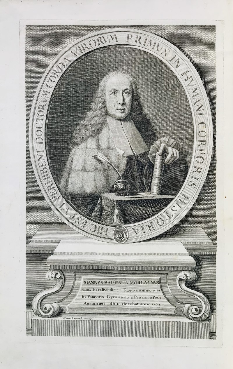 Morgagni's portrait bears the pseudonym “Jean Renard” that Giovanni Volpato used in the first years of his activity as an engraver: the name "Gio. Volpato" also appears at the bottom of the image, on the right.