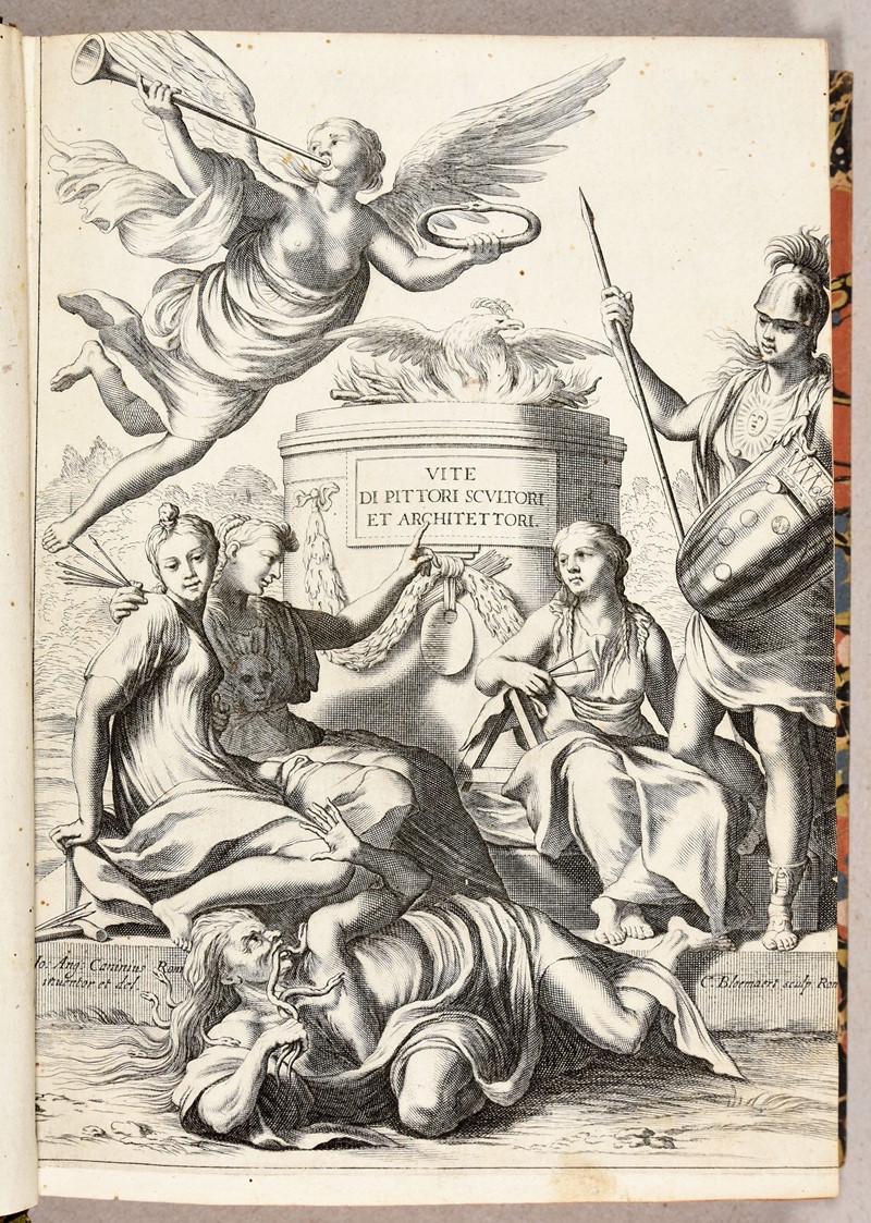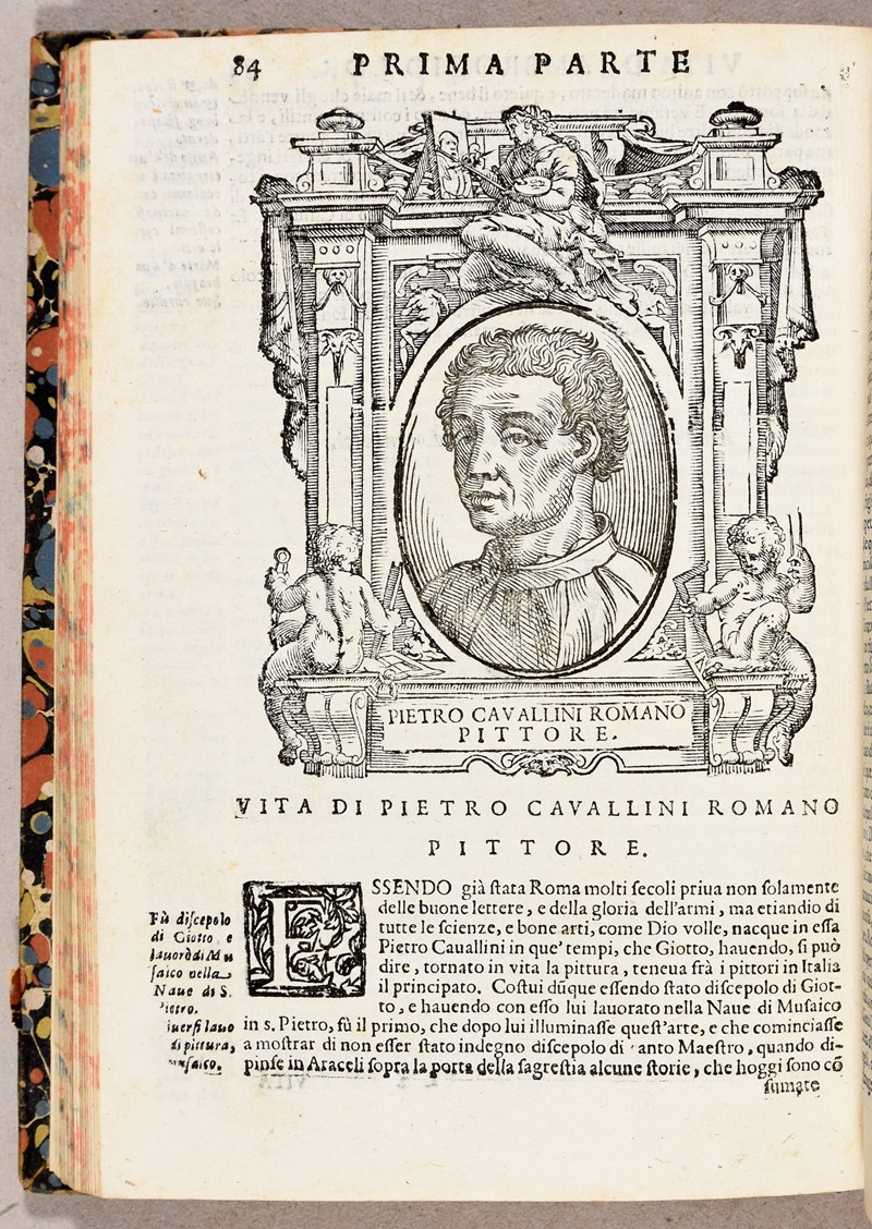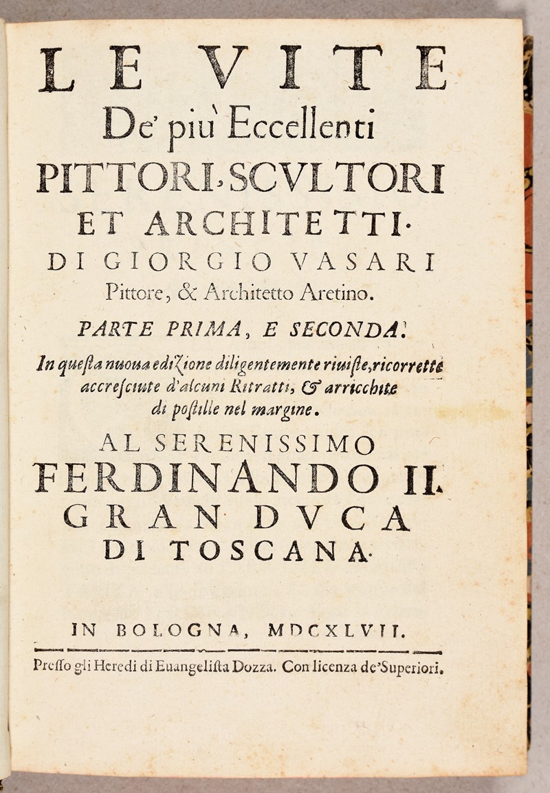 Rara edizione figurata, rivista, corretta ed accresciuta. Per questa edizione il curatore Carlo Monalessi acquistò le xilografie originali utilizzate per la prima edizione figurata Giuntina del 1568 e fece aggiungere diversi nuovi ritratti. I ritratti furono disegnati dallo stesso Vasari e incisi da Coriolano, mentre lo splendido frontespizio allegorico, al primo volume, fu disegnato da Giovanni Angelo Canini e inciso in rame da Bloemaert. Rubin: “Vasari organized the lives in his book into three parts, or ages, roughly corresponding to the fourteenth, fifteenth, and sixteenth centuries, each defined by their distinctive character. He dated the initial stages of the rebirth or recovery of the lost attainments of antiquity to around 1240, when Giovanni Cimabue was born to kindle 'the first lights of painting'…. "[Vasari's] sources in both writing and painting were absorbed and transformed into new expressive forms, whether on palace walls or in artists' lives. Both were meant to charm and please, to be varied and lifelike. They were true to nature but not idealized. Both were modern. The book was more original. Nothing like it had existed before. Literary friends could offer suggestions, but no plan or scheme or program. The 'Lives' are Vasari's own, and probably greatest invention”.