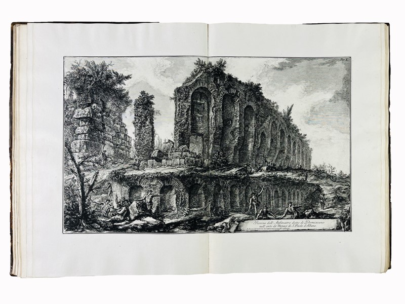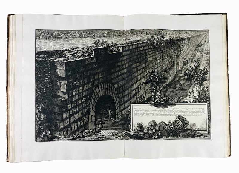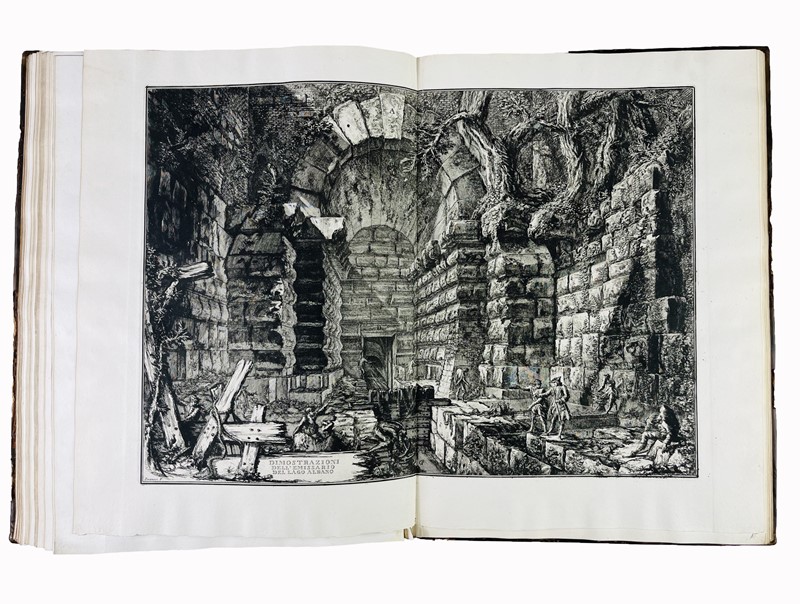 Prime edizioni, incisioni originali di Piranesi in prima tiratura. Le opere illustrano i grandi lavori idraulici eseguiti dai romani nel IV secolo a.C. per porre rimedio ai danni causati dalle inondazioni causati dal Lago Albano. Gli studi archeologici di Piranesi nell'area del Lago Albano furono sostenuti da Papa Clemente XIII.