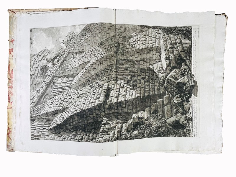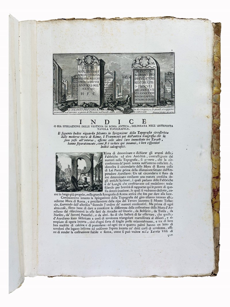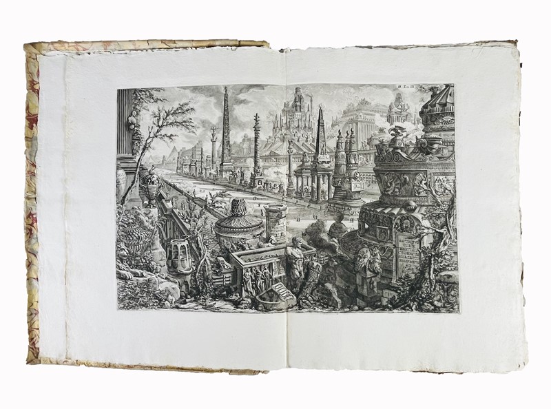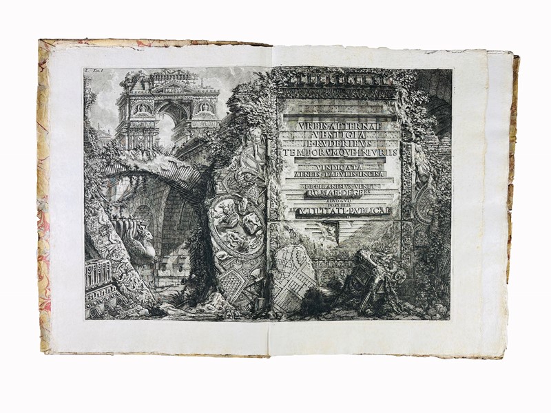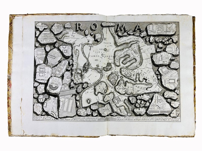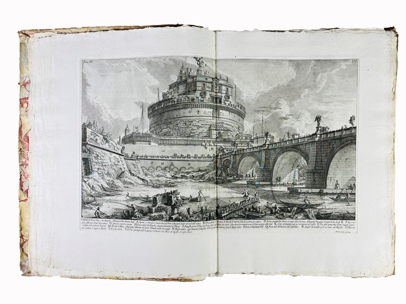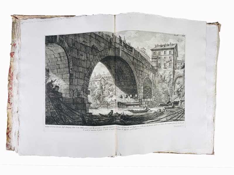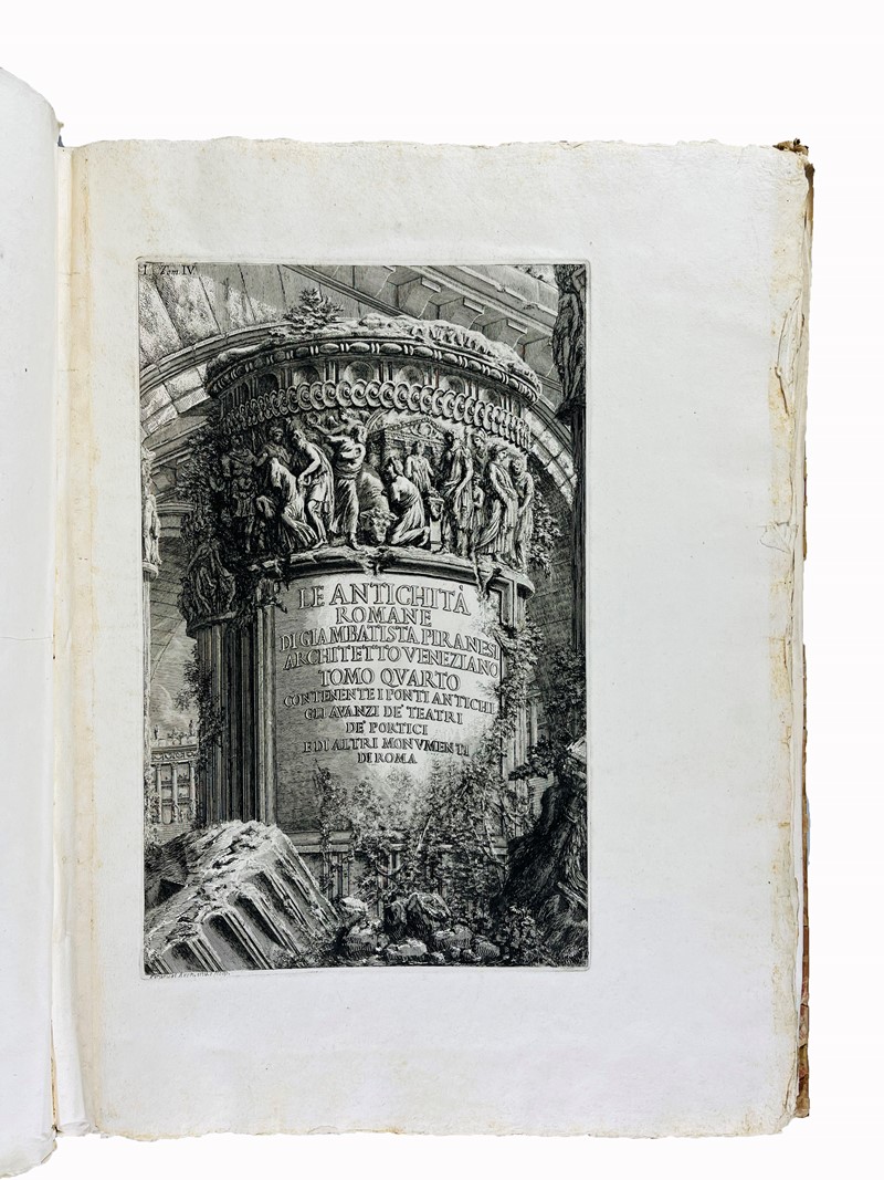 Rarissima prima edizione dell’opera più importante di Piranesi. Questa impresa monumentale, che richiese otto anni di attento studio e scavo da parte di Piranesi, consolidò la sua reputazione di principale protagonista dell'archeologia romana. Il volume I spiega la struttura urbana dell'antica Roma, illustrandone le mura, le difese, gli acquedotti e i monumenti pubblici. I volumi II - III comprendono i progetti della Camera Sepolcrali e sono dedicati ai vasti resti di sepolcri intorno a Roma. Il volume IV si concentra sulle imprese eroiche dell'ingegneria romana documentando i ponti e le strutture monumentali come la Curia Hostilia, la sottostruttura del Tempio di Claudio, il mausoleo di Adriano (Castel Sant'Angelo) e il Teatro di Marcello.