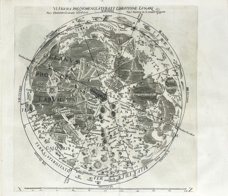 Linda Hall: “The Riccioli moon map is historically of great importance, since it provided the basis for the system of lunar nomenclature still in use. It is more properly referred to as the Riccioli/Grimaldi map, since the Jesuit optician Francesco Grimaldi was apparently responsible for the map itself, while fellow-Jesuit Riccioli invented the names (and wrote the book in which the map appeared). Thus the Sea of Tranquility (Mare Tranquillitatis) traversed by the Apollo astronauts acquired its name here, as Mare Tranquillitatis, as did such prominent lunar craters as Plato, Ptolemaeus, and Tycho.”