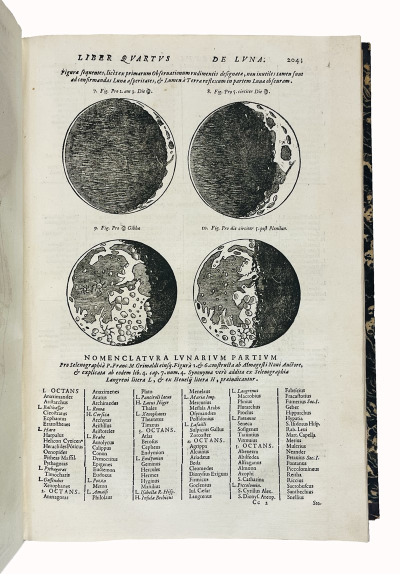 2 Volumi in folio. 345x240 mm. Legatura dell’inizio XIX secolo, mezza pelle viola e carta marmorizzata, filetti e titolo in oro sui dorsi. Pagine [12, inclusi Antiporta e Frontespizio], XLVII, [1], 763 (i.e. 771), [1], numerose illustrazioni xilografiche nel testo, 2 tavole incise in rame ripiegate fuori testo; [6, inclusi Antiporta e Frontespizio], XVIII, 675, [1], illustrazioni e diagrammi xilografici nel testo. Al primo volume le carte 2C3-6 e 2D1-4 presentano una doppia numerazione delle p. 204-211 (ripetendo il numero con l'aggiunta di 1/2 nella p. seguente). Testo su due colonne, marca tipografica nel Colophon in fine ai volumi. In totale 2 Antiporte, Grande vignetta con le Armi del Cardinale Grimaldi sui due Frontespizi, 2 grandi tavole ripiegate fuori testo con la mappa della Luna, tutto inciso in rame. Ex libris ‘Owen Gingerich’ incollato ai contropiatti. Alcune carte brunite, per il resto bell’esemplare.