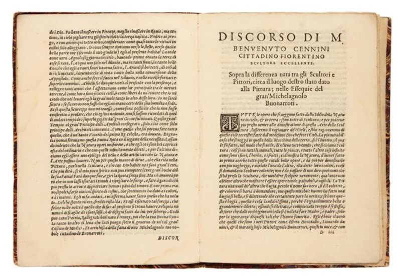 First edition of the funeral oration delivered upon the death of Michelangelo by the Florentine man of letters Giovanni Maria Tarsia (fl. 1564-1607). The volume also contains his dedication to the painter Agnolo Bronzino, a discorso by Benvenuto Cellini "on the difference between sculptors and painters", verses by Antonfrancesco Grazzini detto "Il Lasca" in response to Cellini, and verses contributed by a "B.P. Flor", Giovanni Girolamo Fiorelli, and Michele Capri. It concludes with a series of sonnets in praise of Michelangelo.