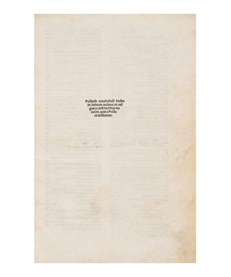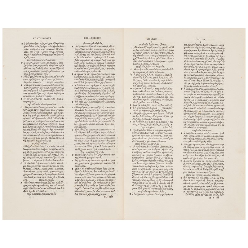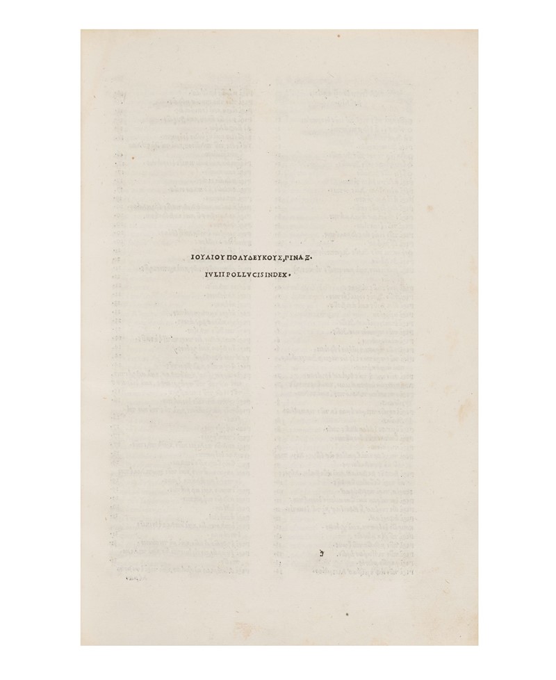 Rarissima Editio Princeps. Importante dizionario greco, testo in magnifici caratteri greci. L'Onomastikon, composto dal grammatico greco Ioulios Polydeukes (Julius Pollux) nel II secolo d.C., è un lessico di locuzioni e sinonimi in dialetto attico. Suddiviso per argomenti, include informazioni preziose su antiche usanze, mitologia e vita quotidiana, toccando temi diversi come oracoli, poesia, cavalli, alberi e navigazione. È inoltre una fondamentale fonte di Antichità Greche e Romane giacché cita numerosi frammenti di opere perdute. Polluce, menzionato nelle Vite dei sofisti di Filostrato, fu titolare della cattedra di retorica presso l'Accademia ateniese sotto l'imperatore Commodo.