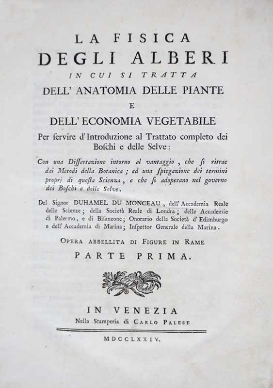 DUHAMEL DE MONCEAU, Henri Louis. La Fisica degli Alberi. Venezia, Palese, 1774