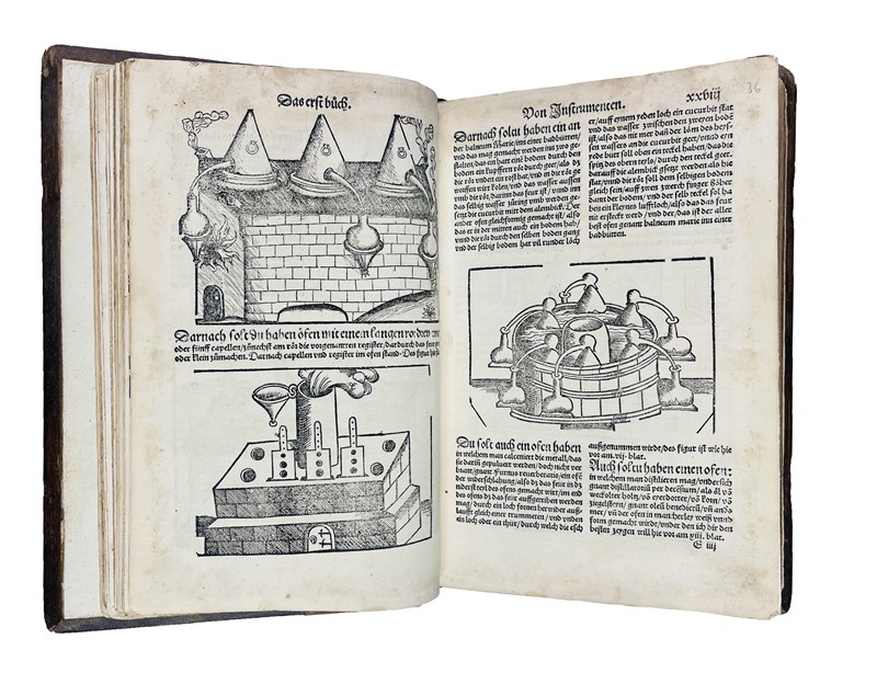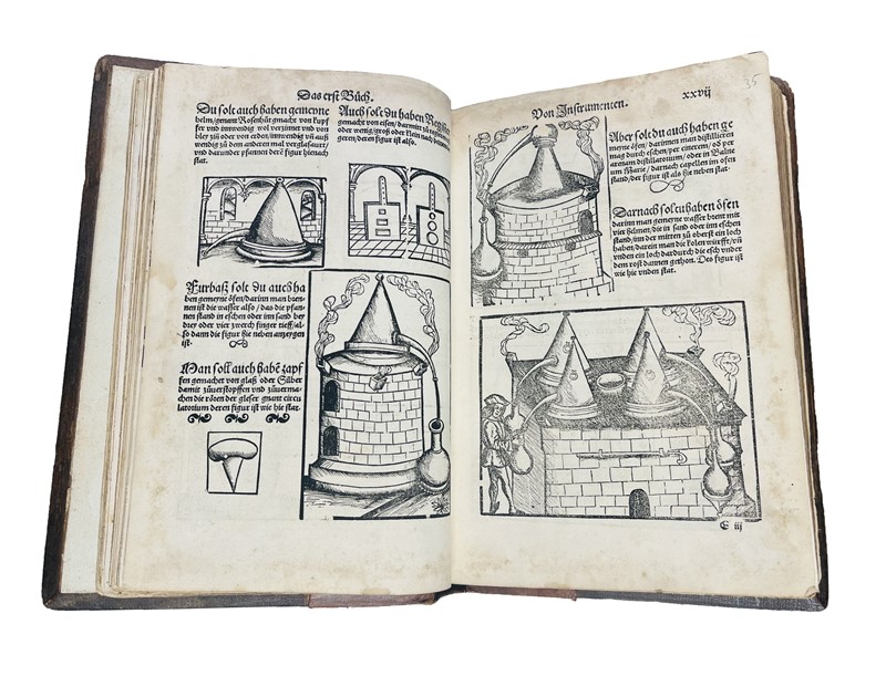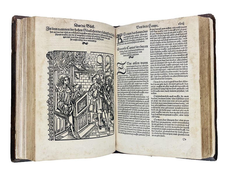 Terza edizione, ancora rara, del cosiddetto "grande libro di distillazione". Le numerose xilografie, interessanti anche per quanto riguarda i costumi storici, mostrano apparecchi di distillazione, farmacie, forni, soggetti anatomici, bagni di vapore, salassi, ecc; molte tratteggiano le piante e le erbe con grande precisione botanica. Il testo descrive la distillazione di acquaviti di vino, idromele, succhi di frutta fermentati e la distillazione di piante, radici e fiori.