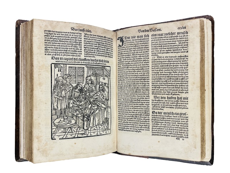 Folio, 290x195 mm, Legatura in mezza pelle di cinghiale su assi di legno. Frontespizio, rinforzato, con grande xilografia a 2/3 di pagina, raffigurante una scena di distillazione, testo in caratteri gotici su 2 colonne, ampiamente illustrato con quasi 150 xilografie. Carte [8], 280, numerate con lettere romane. Colophon in fine, carta 280 recto “…stat Strassburg durch // Bartholomeu[m] Gru¨niger vff Sant Adolffs // tag In de[m] Iar so man zalt nach // Christi geburt. M // ccccc.xxxii.”