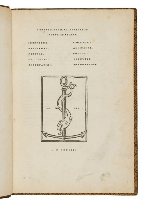 Folio, 299 x 200 mm. Legatura in marocchino marrone scuro dell'inizio del XIX secolo. Caratteri romani e greci, 54 righe più titolo. Collazione: A-K8 L4 M-P8 (K8 bianco): Cc 115, [1]. Stemma di Aldo xilografato sul frontespizio e sul retro dell'ultima pagina, spirale in inchiostro antico nell'angolo superiore di K5. Restauro agli angoli inferiori di P7-8, macchie sparse, alcune macchie isolate.