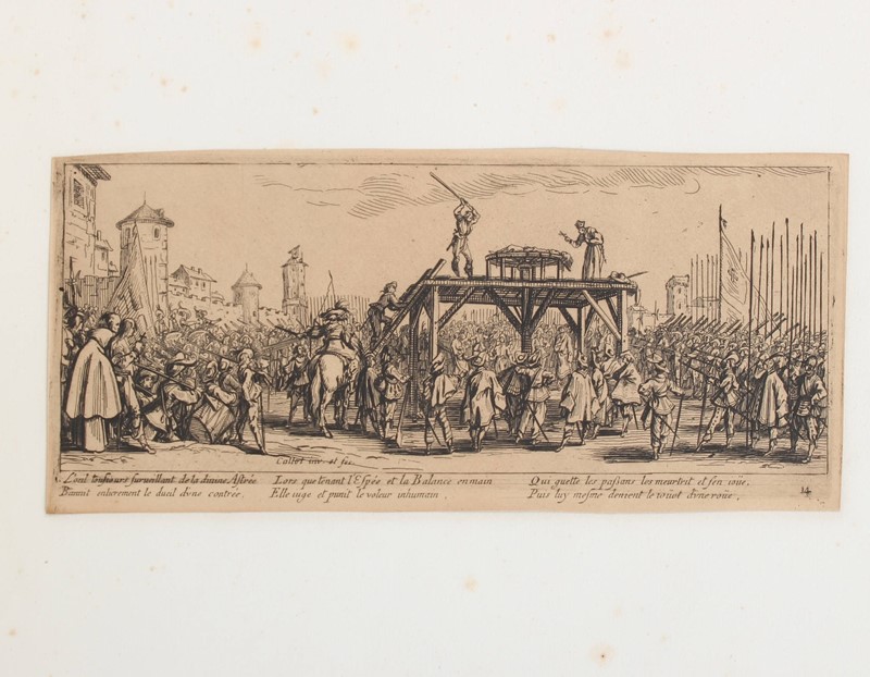 The series shows the sad events that afflicted Lorraine in 1633 when the French besieged Nancy. The tragic compositions reflect the state of mind of an ailing Callot, who in his last years of life witnessed the tragic end of his country. The edition was edited by Israel, Callot's friend: in the legend at the bottom, a poetic description of the scenes depicted in three couplets in rhymed couplets.