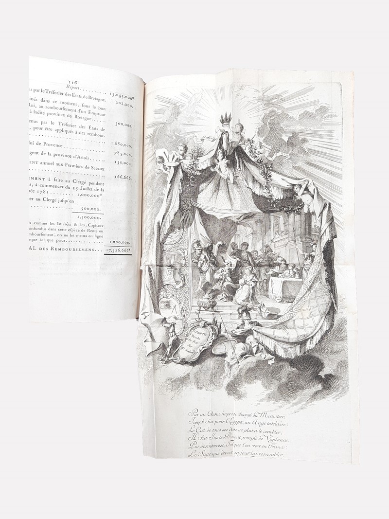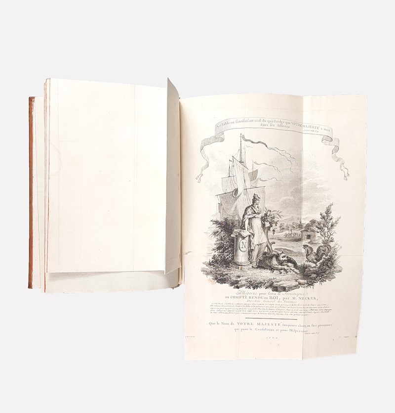 Rarissima prima edizione. Eccezionale esemplare con stampe volanti incise in rame, e 5 opuscoli aggiunti. Il Compte rendu di Necker, costituisce la prima presentazione pubblica del bilancio e delle spese del governo francese. The New Palgrave: “In 1781 Necker's famous Compte Rendu au Roi appeared, addressed rather to the public than to the head of the state. His popularity increased; the success of his report, the first of its class, though incomplete, was great.”. questo esemplare contiene 3 ritratti dei quali 2 in antiporta, 2 antiporte con allegorie, 6 tavole intitolate La Bienfaisance, La Vertu Récompensée, Dédié au Regret du Citoyen, L'Immortalité, Compte Rendu du Roi et Allégorie du Compte Rendu du Roi. 2 carte geografiche con coloritura coeva che indicano la tassazione nei territori della Francia, “Gabelles” e “Traites”. Inoltre sono aggiunti in fine 5 rarissimi opuscoli a testimonianza dell’acceso dibattito che nacque nell’ambito della fisiocrazia francese dopo la pubblicazione del Compte rendu.