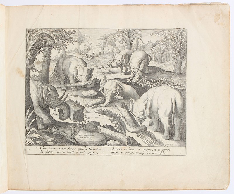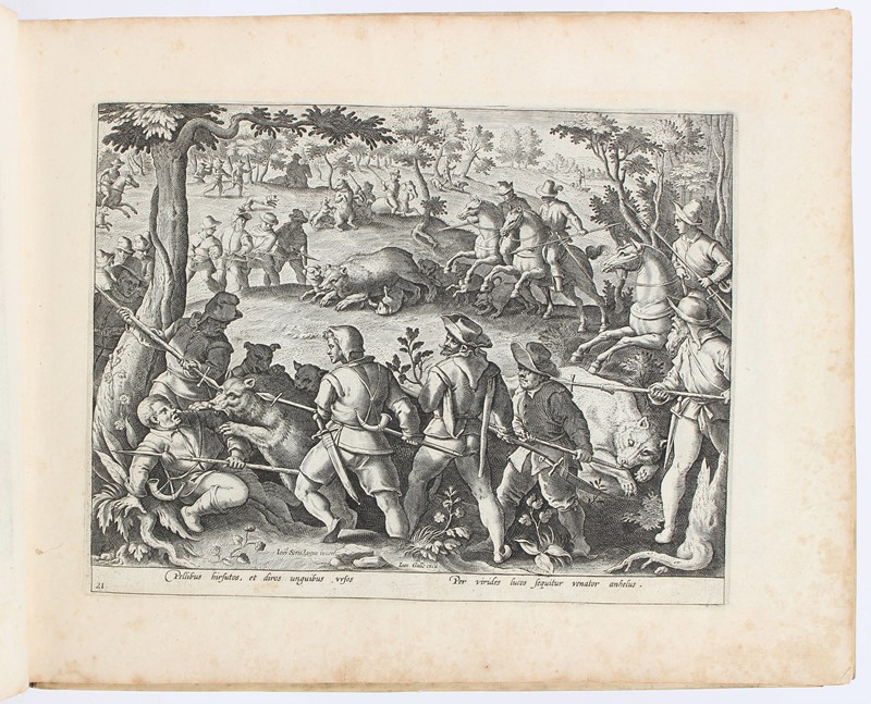 Rara serie completa con le grandi stampe di caccia di Stradanus, che includono temi di falconeria, pesca e persino apicoltura, incise tra il 1578 e il 1596 circa da Philips Galle e altri. L’opera è composta da frontespizio allegorico e 104 tavole, numerate da 1 a 104. Include scene di cattura di rapaci e di caccia con essi, non solo falchi o falconi, ma anche gufi. Le altre stampe di caccia mostrano la caccia a elefanti, vari felini selvatici, cinghiali, orsi, coccodrilli e altra selvaggina di grossa taglia, scimmie (che indossano stivali!), animali più piccoli come conigli, tassi e istrici, ma anche unicorni, fauni (che suonano il flauto di Pan!), serpenti giganti, draghi, mostri marini e altre creature mitiche. Alcune scene sono certamente inquietanti per chiunque abbia a cuore gli animali: una mostra un elefante vivo con la proboscide mozzata.