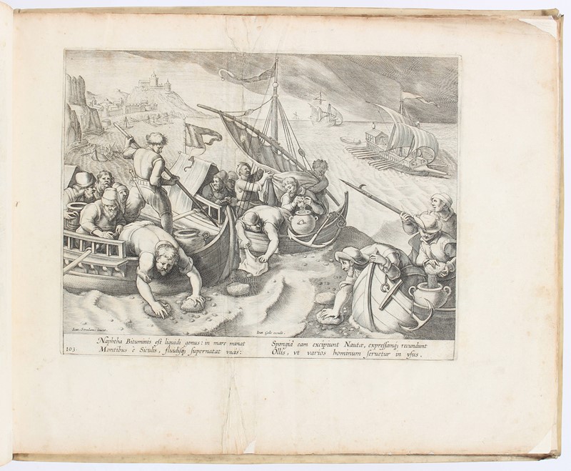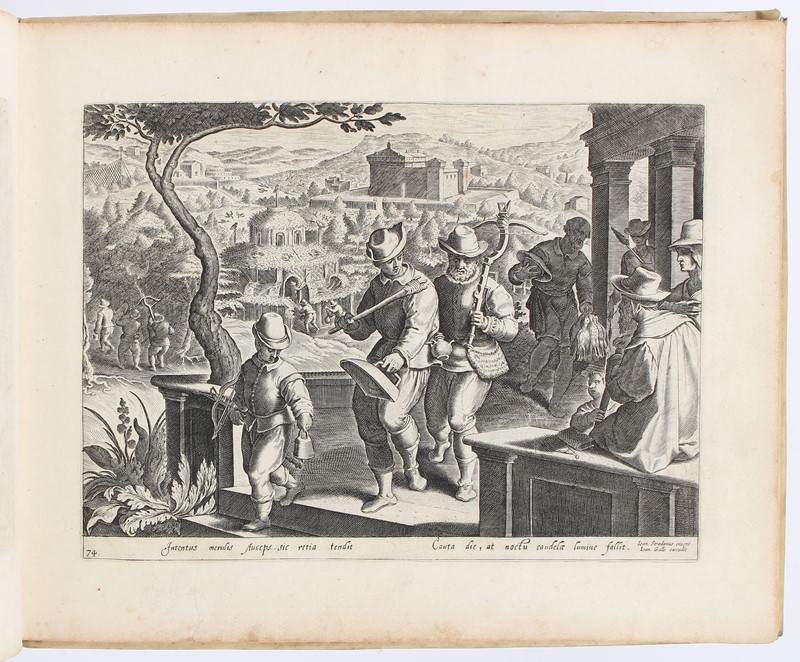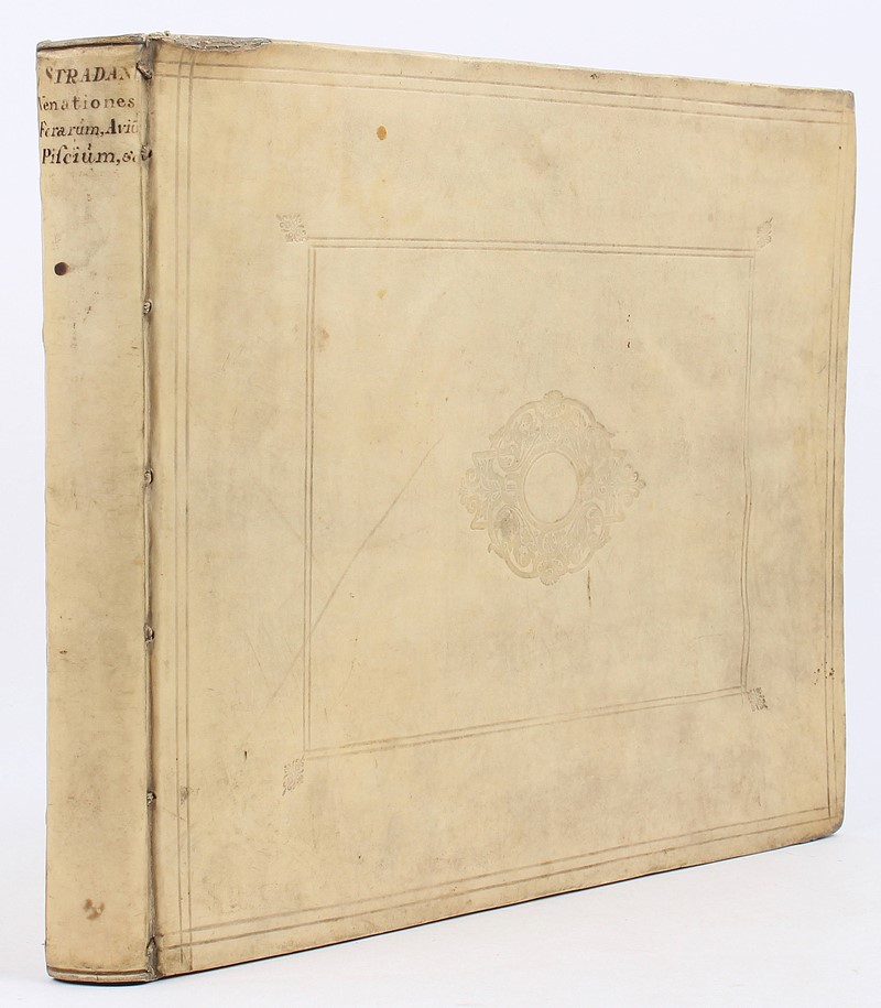 Folio oblungo. 290x370 mm. Legatura coeva in pergamena con impressioni a secco sui piatti, titolo manoscritto sul dorso. Frontespizio e 104 tavole numerate. Tutte le tavole recano i nomi dell’Autore ‘Ioan Stradanus ‘invent’ e dell’editore ‘Ioan Galle‘excudit’; alcune recano il nome dell’incisore “Joan. Collaert, Carol. De Mallery, Cornelius Galle, Theodorus Galle”. Sotto le immagini didascalie di due o quattro versi latini. Restauro al margine del Frontespizio e della Tavola 16; strappo restaurato nella Tavola 103. Foxing nei margini e qualche macchietta ma in complesso buon esemplare.