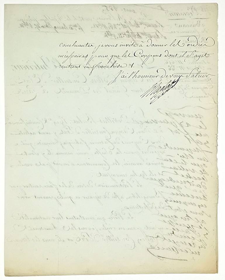 Lettera, firmata in qualità di Ministro dell'Interno, inviata al Cittadino Jean-Baptiste Collin, Conte de Sussy, Consigliere di Stato, Direttore Generale delle Dogane a Parigi. Riguarda due lotti difettosi di cashemere che devono rientrare dalla Svizzera, da restituire in franchigia. Sul margine una lunga annotazione manoscritta in inhiostro nero del Conte de Sussy. Jean-Antoine Chaptal, conte di Chanteloup, 1756 - 1832, eminente chimico, nonché medico, agronomo, industriale, statista, educatore e filantropo, fu nominato Ministro dell’Interno da Napoleone nel 1800, e fu molto attivo nel promuovere l’industrializzazione e la riorganizzazione dell’amministrazione francese. Mantenne la carica fino alle sue dimissioni, il 6 agosto 1804.