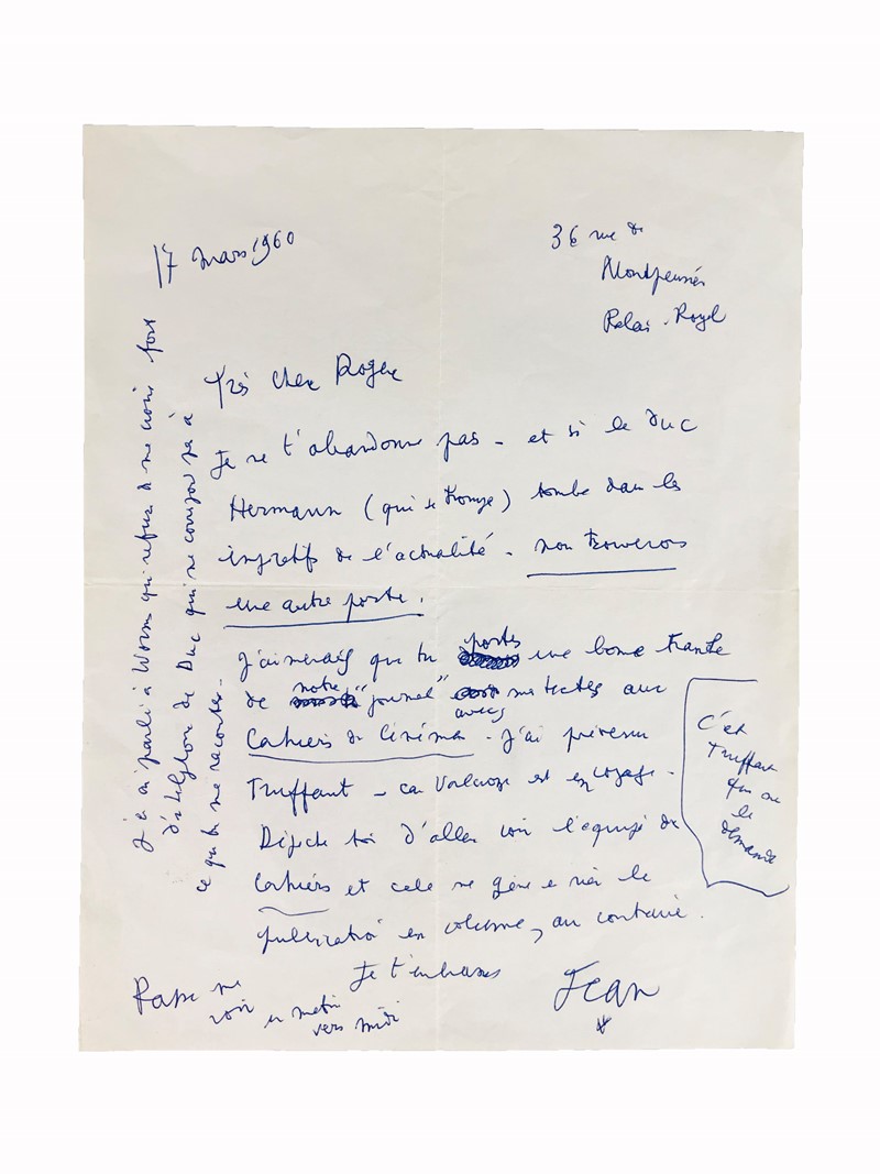 «J'aimerais que tu portes une bonne tranche de notre "journal" avec mes textes aux "Cahiers du Cinéma"-J'ai prévenu Truffaut - car Valcroze est en voyage.»