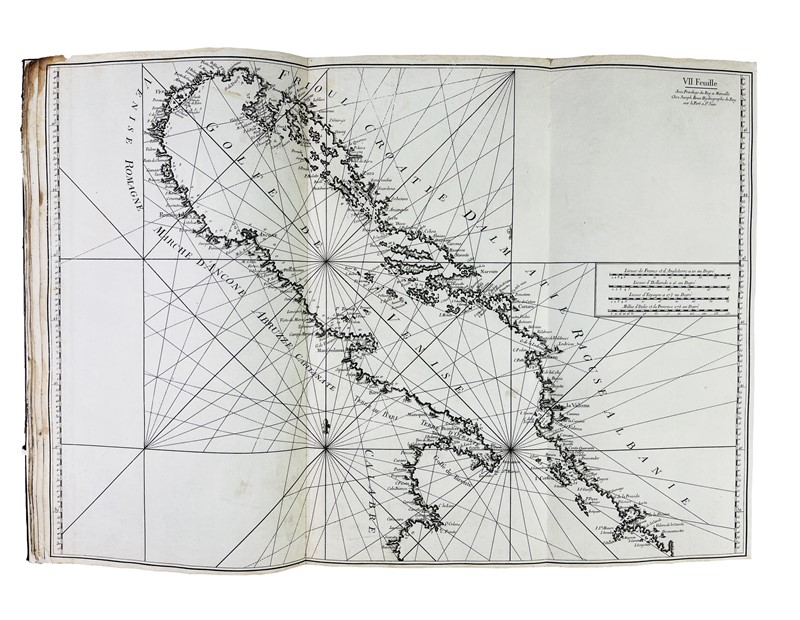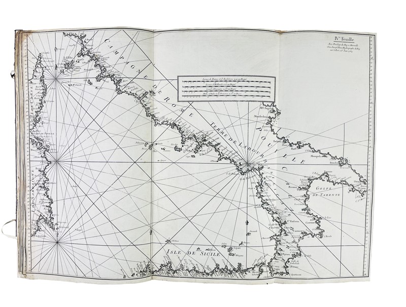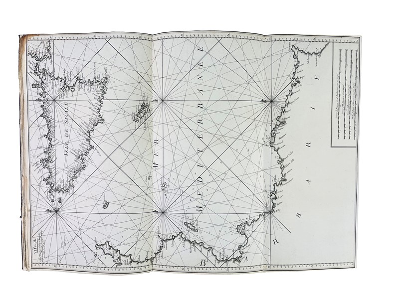 In Folio, 567x310 mm. Legatura in tutta pelle coeva di recupero con restauro conservativo al piatto inferiore con lacci in pelle bianca. Sguardie nuove. 12 carte nautiche incise in rame, su carta forte azzurrata e bianca, che misurano circa 550x800 mm. La legatura proviene da un esemplare del medesimo atlante dell’edizione pubblicata da Gravier e a Genova, come testimonia l’elenco delle tavole applicato all’interno del piatto. Alcuni aloni e macchie al verso della prima e dell’ultima carta.