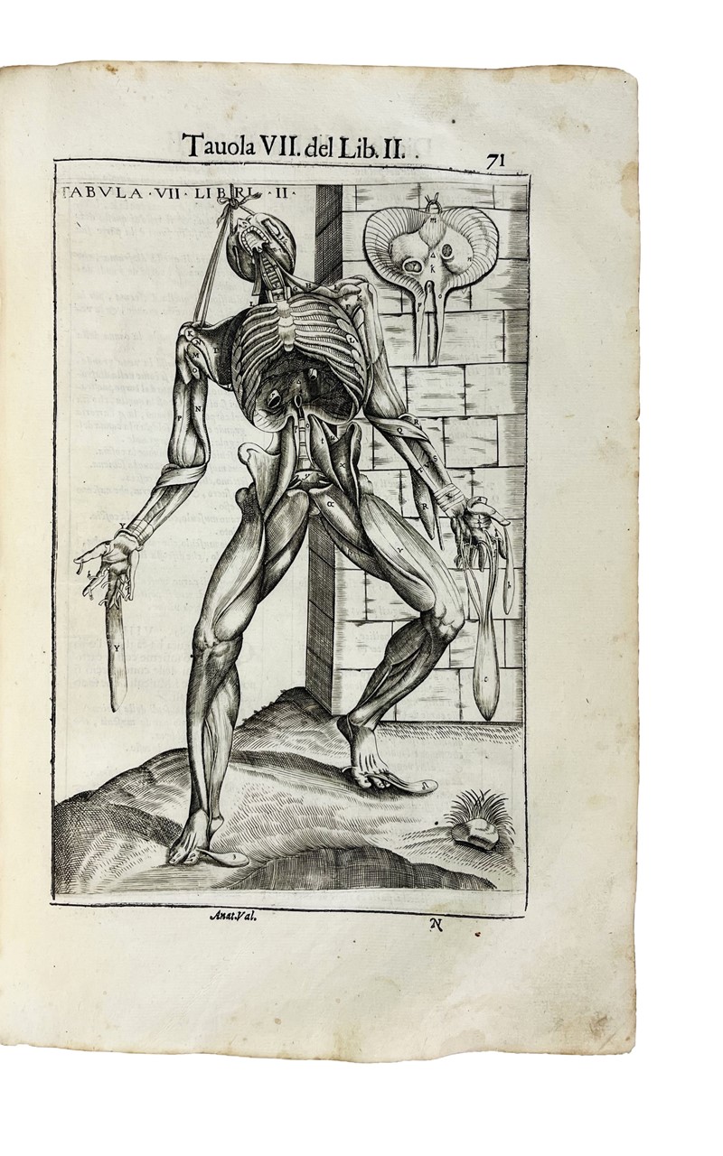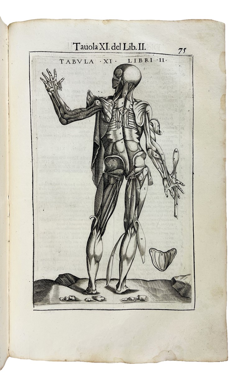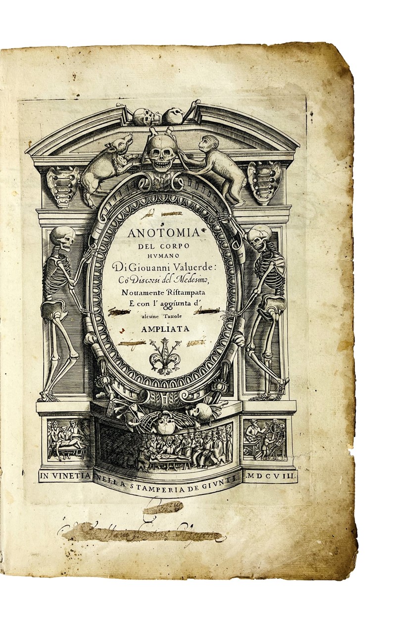 Rara e celebre edizione figurata con le incisioni di Nicolas Beatrizet. Si tratta della seconda edizione italiana, ma la prima a contenere le quattro tavole relative ai muscoli aggiunte tra le carte 82-83. Molto suggestivo il Frontespizio architettonico, con il titolo sorretto da due scheletri e tre vignette con dissezioni anatomiche alla base. Valverde, che fu uno dei più grandi anatomisti del XVI secolo, il quale divulgò l’anatomia di Galeno e Vesalio. Le suggestive incisioni di Nicolas Beatrizet su disegno di Gaspar Becera, di gusto vesaliano divennero lo standard per opere anatomiche per oltre un secolo. Alcune tavole recano le iniziali NB. Hamusco, ca 1525-ca 1588, fu allievo di Realdo Colombo a Padova. Nonostante sia stato spesso tacciato di aver plagiato Vesalio, l’opera di Hamusco se ne differenzia invece in modo significativo nel testo e nelle illustrazioni; inserisce per la prima volta il resoconto di Colombo sulla circolazione polmonare e 15 nuove illustrazioni non derivanti da Vesalio vengono inserite nel libro, dove peraltro anche le tavole vesaliane sono ritoccate. Morton: “The first great original medical book in Spanish and the most original of the “pagliarisms” from Vesalius... The plates were engraved by Nicolas Beatrizet probably after Gaspar Becerra, a pupil of Michelangelo. The book contains numerous revisions to Vesalius and other discoveries by Valverde.”
