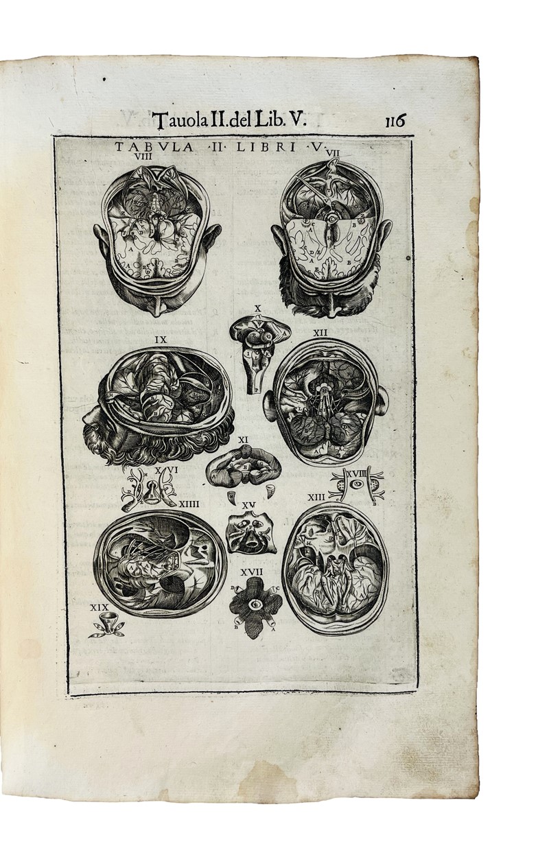 Folio. 320x215 mm. Legatura coeva in pergamena floscia, titolo manoscritto al dorso. Carte 18 non numerate, compreso Frontespizio, 154. La data 1606 compare nel Colophon al verso dell’ultima carta, nel Frontespizio la data è 1608. Frontespizio calcografico in cornice architettonica figurata, ritratto dell'autore a carta a2v, 42 tavole a piena pagina nel testo, 4 tavole fuori testo fra le carte 82 e 83. In totale 46 tavole anatomiche a piena pagina incise in rame. Iscrizioni manoscritte sul margine inferiore e sul verso del Frontespizio, parzialmente cancellate. Tracce d’uso alla legatura con lieve mancanza alla pergamena dell'angolo posteriore, arrossamenti e tracce di gora, piccolo foro alla Tabula I che non lede l’immagine, trascurabile restauro al margine superiore della carta Z.