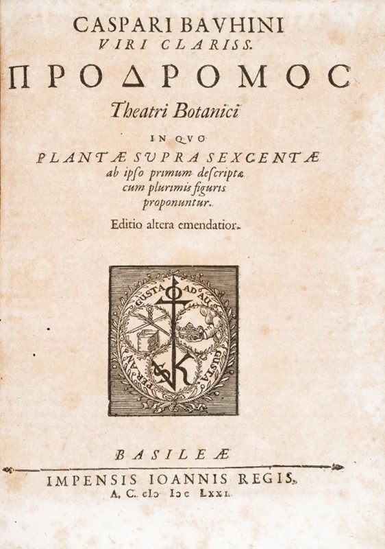 BAUHIN, Kaspar. Pinax Theatri Botanici sive Index in Theophrasti Dioscoridis Plinii et Botanicorum qui à seculo scripserunt opera Plantarum circiter sex millium ab ipsis exhibitarum nomina cum earundem Synonymijs et differentijs...